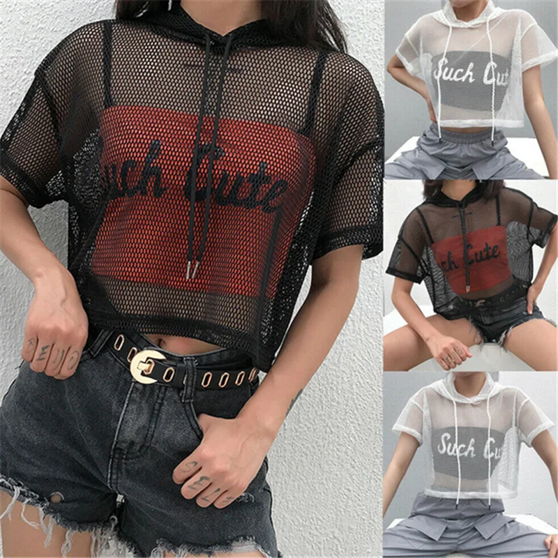 Женская футболка с коротким рукавом, сетчатый топ с капюшоном, открытые сексуальные шорты в стиле панк-рок, укороченный топ, белая футболка, ажурная черная