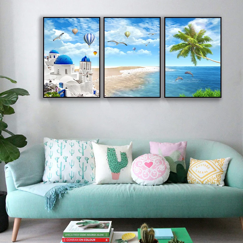 Европейский город тропический пейзаж плакат Скандинавская Картина на холсте настенный Арт Принт Синий воздушный шар Пляжный Пейзаж картина украшение дома