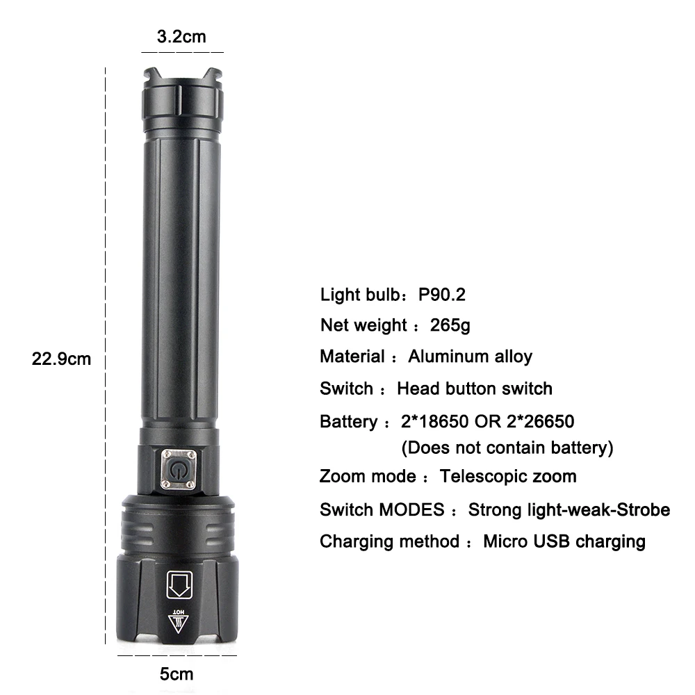 Номер моделиXHP90.2 Ultra Bright LED Flashlight Rechargeable USB