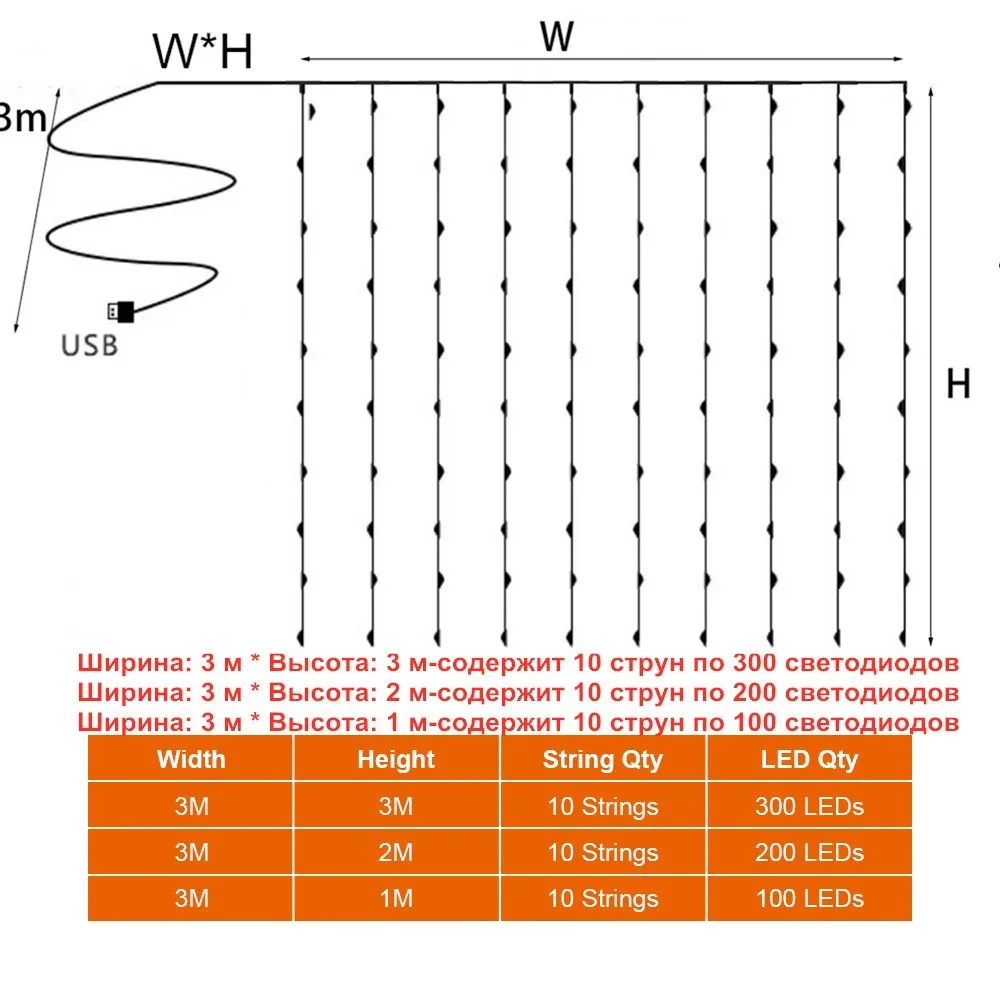 Информация о продукте:Название продукта: Светодиодный светильник для занавесокМатериал: пластик + серебряная медная проволокаРазмер продукта: 3mx1m-100leds/3mx2m-200leds/3mx3m-300ledsСветодиодный цвет: теплый белый/многоцветныйПитание от: USBНапряжение: 5 В постоянного токаСветильник источник света: светодиодныйСрок службы: 50000 часовС пультом дистанционного управления: ДаПереключатель 8 режимов: на USB или пульте дистанционного управленияРежим 1: комбинацияРежим 2: в волнеРежим 3: последовательныйРежим 4: медленное свечениеРежим 5: чеканка/вспышкаРежим 6: медленное выцветаниеРежим 7: мерцание/вспышкаРежим 8: устойчивыйХарактеристика:1. Продукт низкого давления, светильник, шнур, лампа не протекает, струна водонепроницаемая2. Ламповые бусины не нагреваются, не нагреваются, могут быть тронуты3. Безопасная, высокая гибкость, простота и быстрая работа4. Низкая температура, долгий срок службы, 360 градусов освещения, низкая потребеление энергии5. Продукт небольшой по размеру, светильник по весу, принимает логистику и доставку6. 8 режимов для вас, чтобы выбрать ваши любимые блестящие огниСветильник может легко создавать праздничные или вечерние ощущения;Идеально подходит для украшения вашего дома, комнаты, сада и т. д.Идеально подходит для Рождества, свадьбы, церемонии и других праздников и мероприятий;Посылка:1 xLED Рождественская сказочная гирлянда