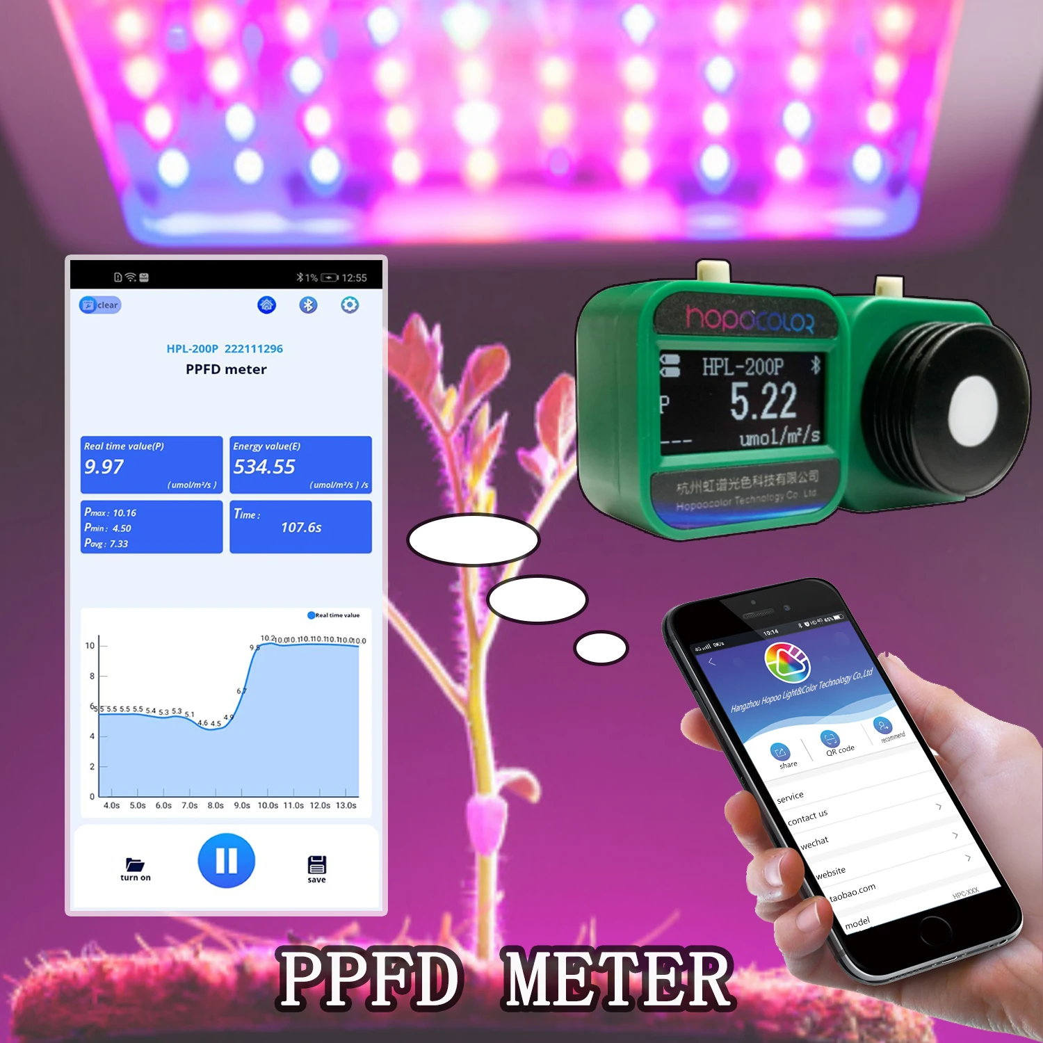 HPL220P измеряет фотосинтетический фотонный потокПлотность в пределах 400-700 нм, беспроводное соединение Bluetooth.