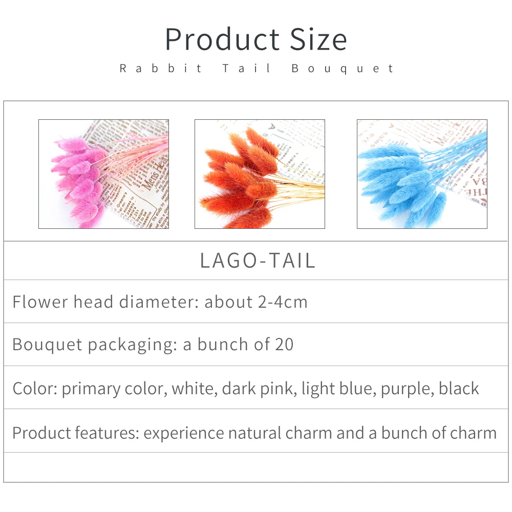 Описание:Состояние: абсолютно новыйЦвет: натуральный, белый, розовый, синий, фиолетовый, черныйМатериал: Натуральные сушеные цветыТип материала: трава с кроличьим хвостомДиаметр головки цветка: 2-4 см, длина ствола цветка: 55 см