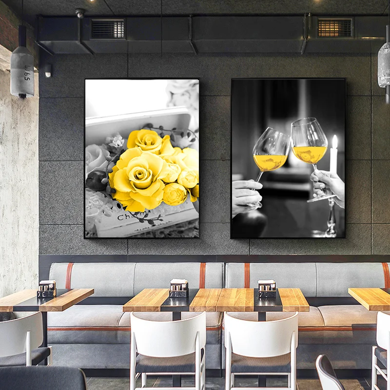 Скандинавская желтая картина цвета шампанского, вино, розы, холст, настенный плакат с художественным принтом для кухни, гостиной, картина, домашний декор