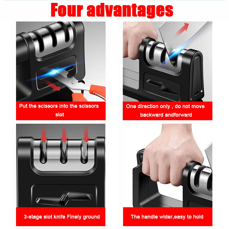 Характеристики: Название: Многофункциональная точилка 4 в 1 Материал рукоятки: ABS Материал слота уровня 3: Вольфрамовая сталь, керамика, алмаз В чем разница между обновленной версией и старой 1. Шлифовальные ножницы 2. Односторонняя быстрая заточка экономит время и силы 3. Тонкая шлифовка 4. Широкая ручка Особенность: * Стильный и безопасный дизайн, легко моется и хранится. * Нескользящие резиновые ножки обеспечивают вашу устойчивость при заточке * 3 этапа заточки (тонкая, керамическая и грубая) для обеспечения идеального эффекта заточки