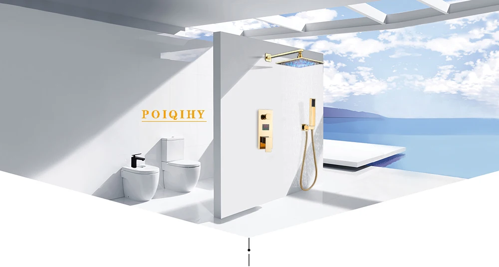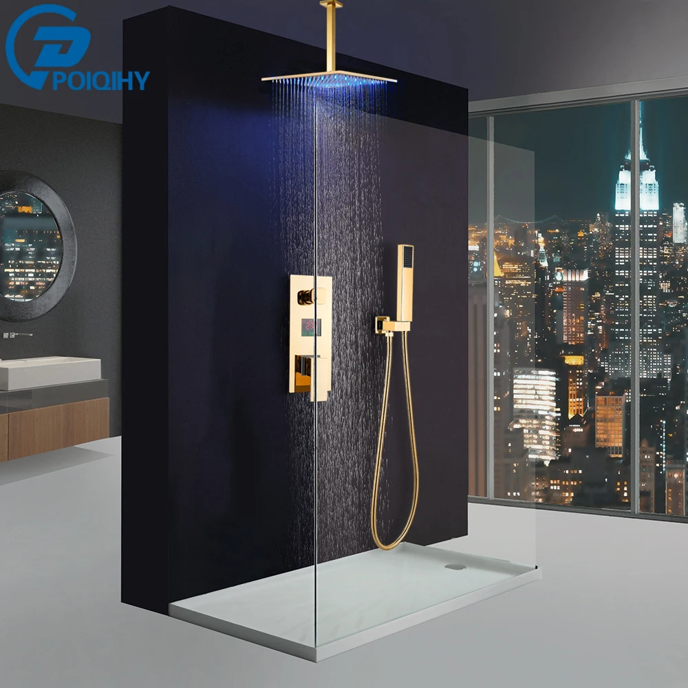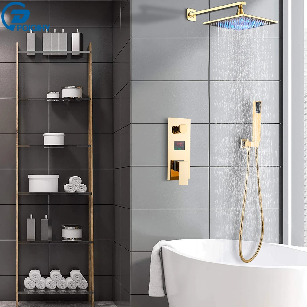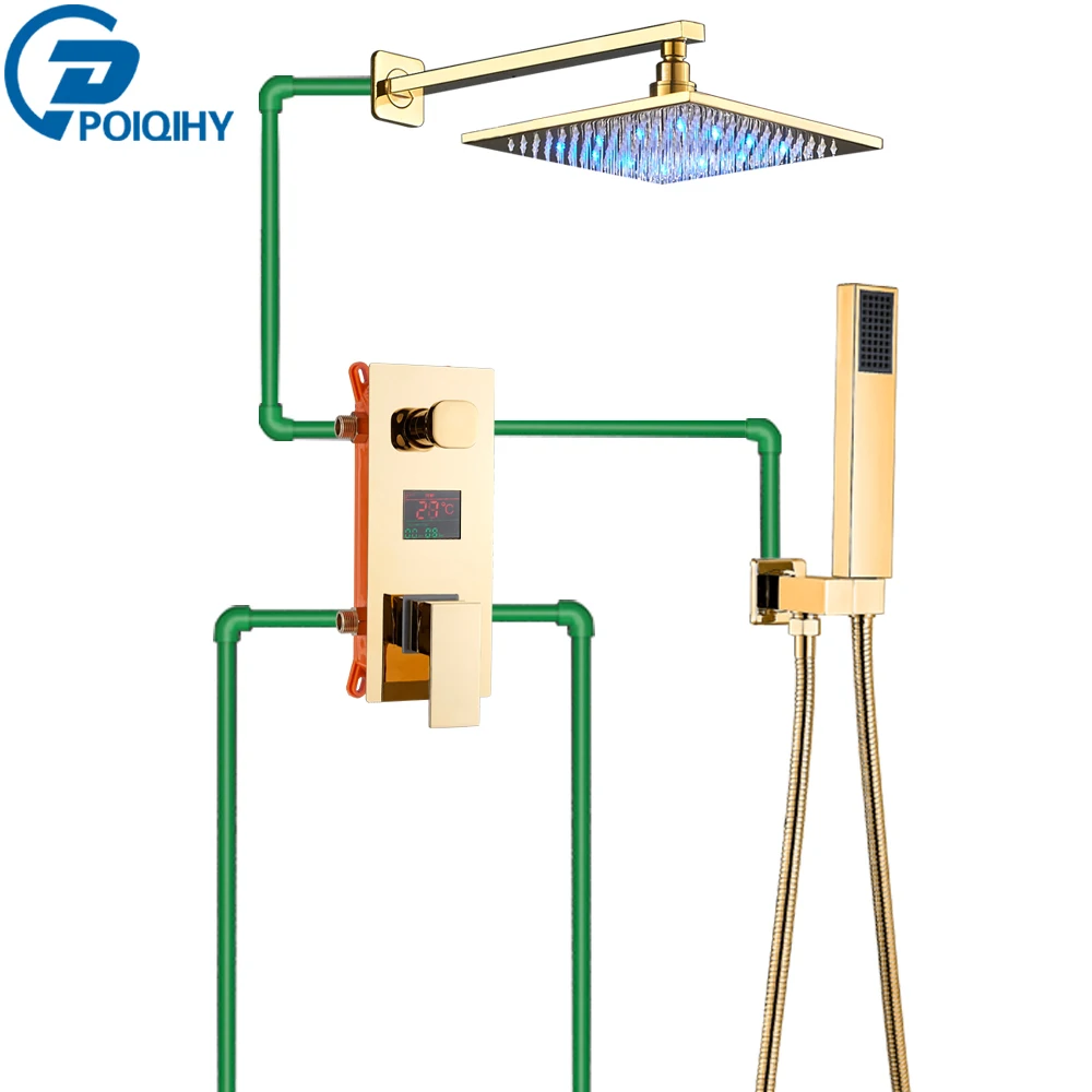 POIQIHY цифровой Дисплей смеситель для душа Золотой светодиодный светильник набор для душа настенный Температура показать Concea светодиодный душ смесители кран