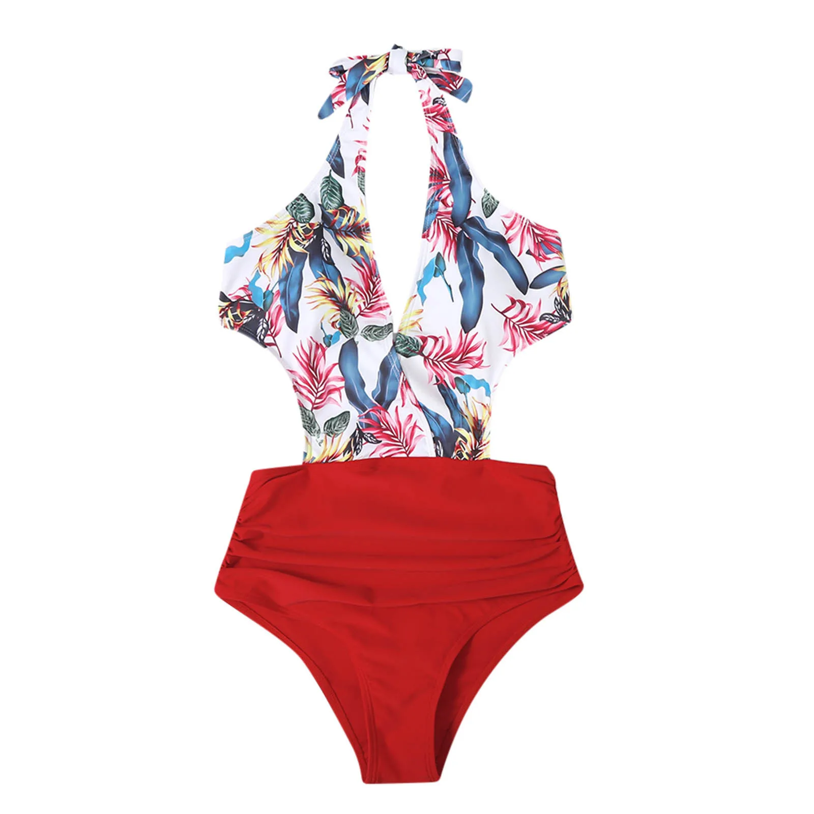 Женский слитный купальник с цветочным принтом, пуш-ап, с лямкой на шее, сексуальное боди, купальные костюмы, бикини с высокой талией и открытой спиной, монокини 2021