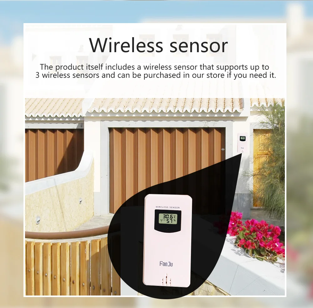 Особенности метеостанции: 1. Вечный календарь до 2099 года; 2. День недели на 8 языках, выбираемых: английский, немецкий, итальянский, французский, испанский, голландский, датский и русский; 3. Время в дополнительном 12/24 часовом формате; 4. Автоматическая калибровка сервиса сетевого времени; 5. Барометрическое давление: -Сеть источника данных давления воздуха -Давление альтернативно в hPa/mb или inHg или mmHg; 6. Скорость и направление ветра: -Данные о скорости и направлении ветра -Скорость ветра альтернативно в км/ч или миль/ч; 7. Диапазон измерения влажности в помещении: от 20% RH до 95% RH; 8. Температура в помещении: -Диапазоны измерения температуры: от-20 ° C до 60 ° C или (от-4 ° F до 140 ° F) -Температура альтернативно в дегс или дегф; 9. Минимальное/Максимальное отображение влажности и температуры; 10. По ощущениям как данные о температуре; 11. Функция прогноза погоды на будущее и отчета о температуре, информация о прогнозе погоды, предоставляемая сетью Подключается напрямую к сети Wi-Fi; 12.USB-порт для зарядки электронных устройств. Источник питания: Батарейка: 2 x LR6 AA (не входит в комплект) Адаптер: DC5V 1.2A (входит в комплект) Беспроводной наружный Датчик: Диапазон измерения наружной температуры: -40 ° C (-4 ° F) ~ 70 ° C (158 ° F) Наружный Диапазон измерения: от 20% до 95% отн. Влажности Частота передачи данных: 433 МГц Диапазон беспроводной связи: Макс. 60 м (открытая площадь) Батарейки: 2 x LR06 (UM-3), 1,5 V (размер AA) (не входят в комплект) Класс защиты: IPX4 Примечание: Этот продукт прошел комплексное обновление (включая Bluetooth). После обновления его эксплуатация отличается от старого продукта. Чтобы выделить их, мы удалили логотип на новом товаре. Не волнуйтесь, новый не использует логотип, это по-прежнему наш бренд «fanju». Для включения функции WiFi требуется адаптер питания. Рекомендуем использовать адаптер. Аккумулятор может использоваться в качестве резервного источника питания. Когда вы выходите из дома и отключаете источник питания, аккумулятор может заставить метеостанцию работать только для восстановления подключения адаптера питания. Если вам нужно Электронное руководство по эксплуатации или Контактное видео, пожалуйста, свяжитесь с нами и предоставьте свой адрес электронной почты. Спасибо за вашу поддержку.