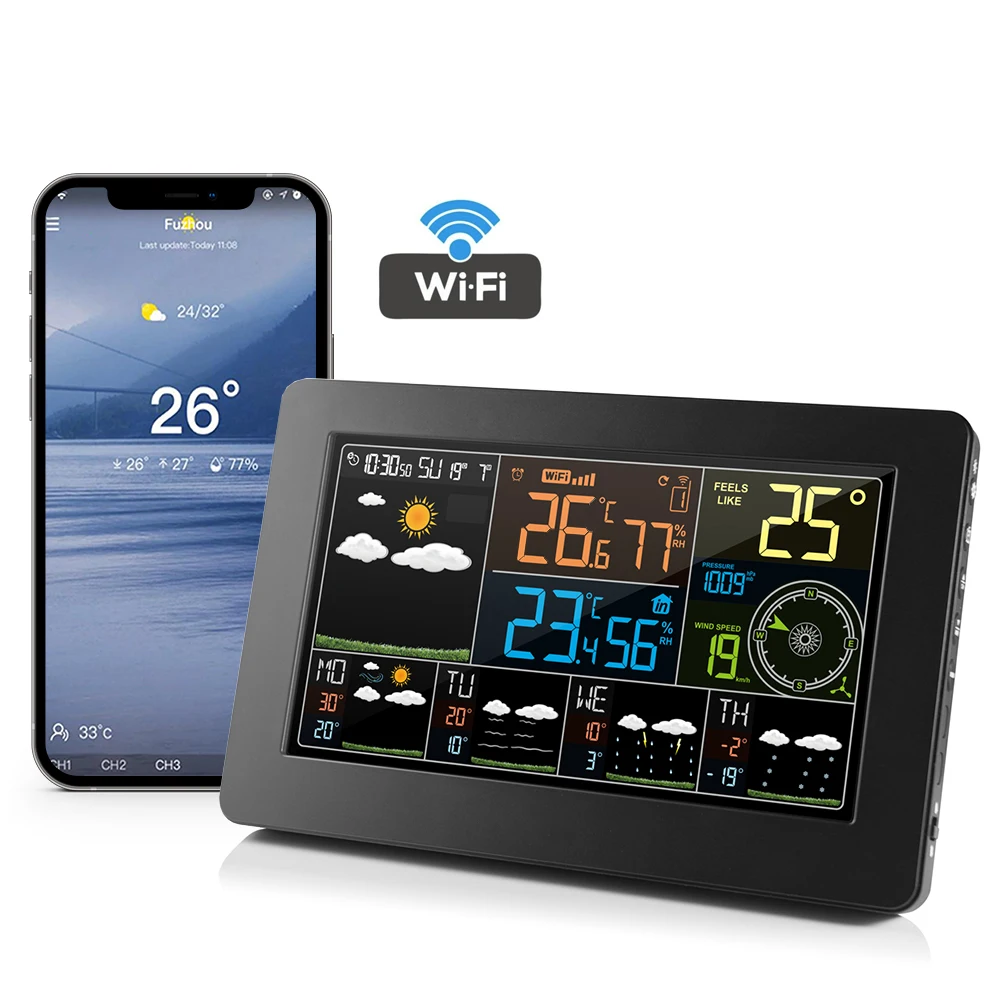 Цифровые настенные часы с будильником FanJu FJW4, настенная комнатная и уличная Wi-Fi метеостанция с датчиком температуры, влажности, атмосферного давления, силы ветра для прогноза погоды с ЖК-дисплеем