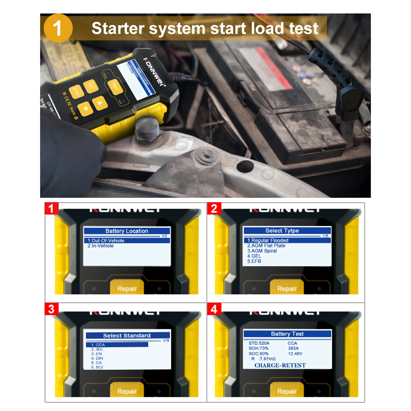 KW510 тестер батареи + c-harger + ремонт-это тестер новый аккумулятор, обновленный с черно-белого экрана тестер, чтобы проверить работоспособность батареи быстрее и точнее, включая проверку рабочего состояния генератора. Поддержка не только тестирования работоспособности аккумулятора, но и тестирования аккумулятора тест на проворот коленвала, тестирования зарядки аккумулятора. Это профессиональные инструменты для диагностики автомобильных аккумуляторов с помощью графического инструмента контроля напряжения, с цветным экраном 2,4 дюйма и специальным дизайном рисунка, этот продукт станет идеальным инструментом для тестирования аккумуляторов. Особенности:Поддержка автомобильного аккумулятора-проверка работоспособности и состояния, зарядка и ремонт-все в одном.Высокоточный тестер батарей.Функция импульсного ремонта поможет вам исправить и увеличить срок службы батареи и производительность.Логические настройки работы, удобные и быстрые.Большой ЖК-экран с диагональю 2,4 дюйма, дисплей r-esulт четкий и читаемый даже в яркие солнечные дни.Огнестойкий материал для безопасного и длительного использования. Характеристики:Вилка: вилка ЕС, вилка Великобритании, вилка США, вилка Австралии (опционально)Цвет: желтый + черныйМатериал: АБССфера применения: 100-2000ccaЯзыки: английский, немецкий, французский, голландский, русский, испанский, итальянский, португальскийВес посылка: 703 г/фунтаПосылка: 190*150*70 мм/7,5*5,9 * 2.8in Упаковочный лист:1 * тестер автомобильного аккумулятора1 * Руководство пользователя1 * кабель питания