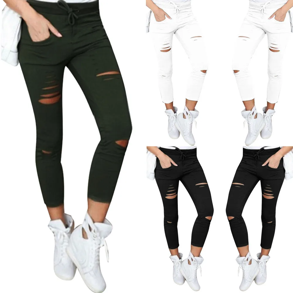 # H40 2020 модные сексуальные обтягивающие леггинсы с дырками черные белые женские джинсовые обтягивающие рваные брюки Стрейчевые обтягивающие брюки-карандаш с высокой талией