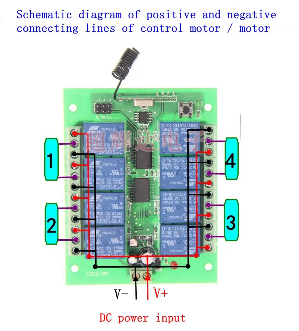 Нажмите и удерживайте кнопку No. 1 пульта дистанционного управления, реле, соответствующее кнопке No. 1, будет тянуть, и реле будет отключено после освобождения. Нажмите кнопку No. 2, и реле, соответствующее кнопке No. 2, потянется, и оно будет отключено после освобождения; Работа в этом цикле.