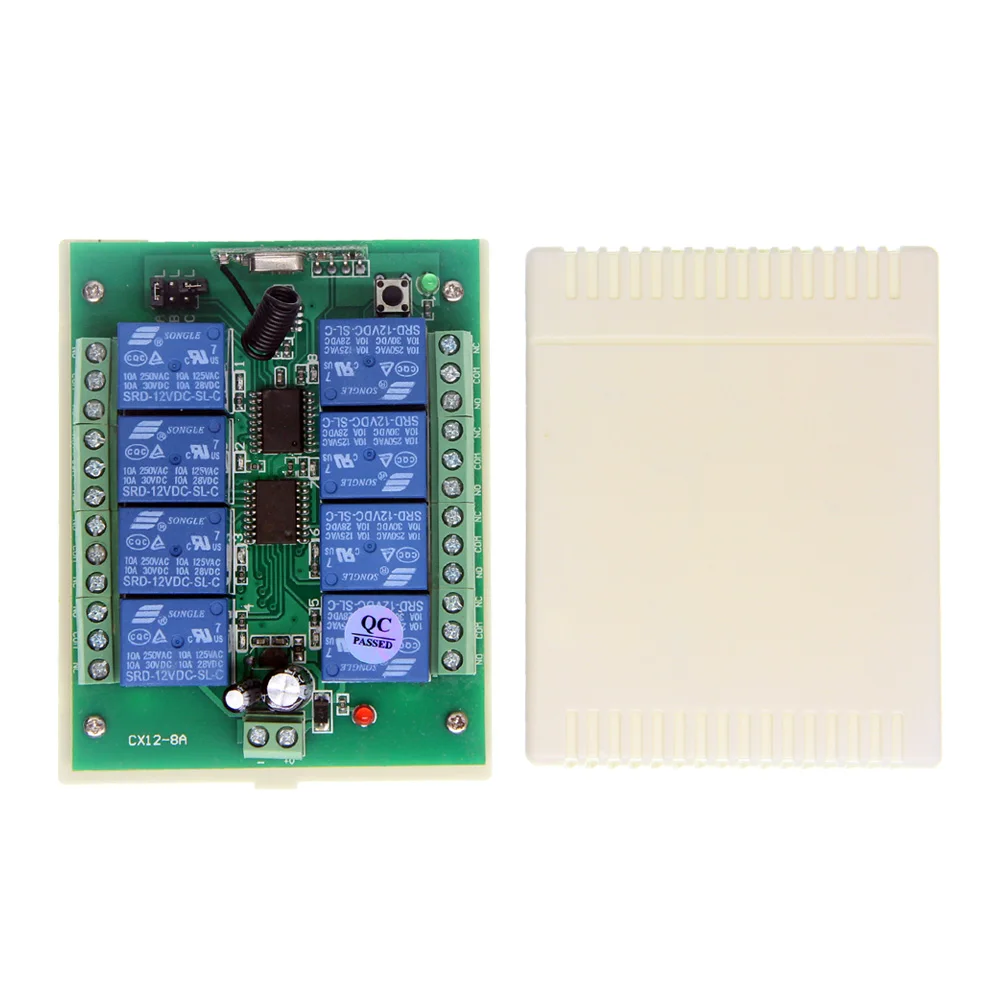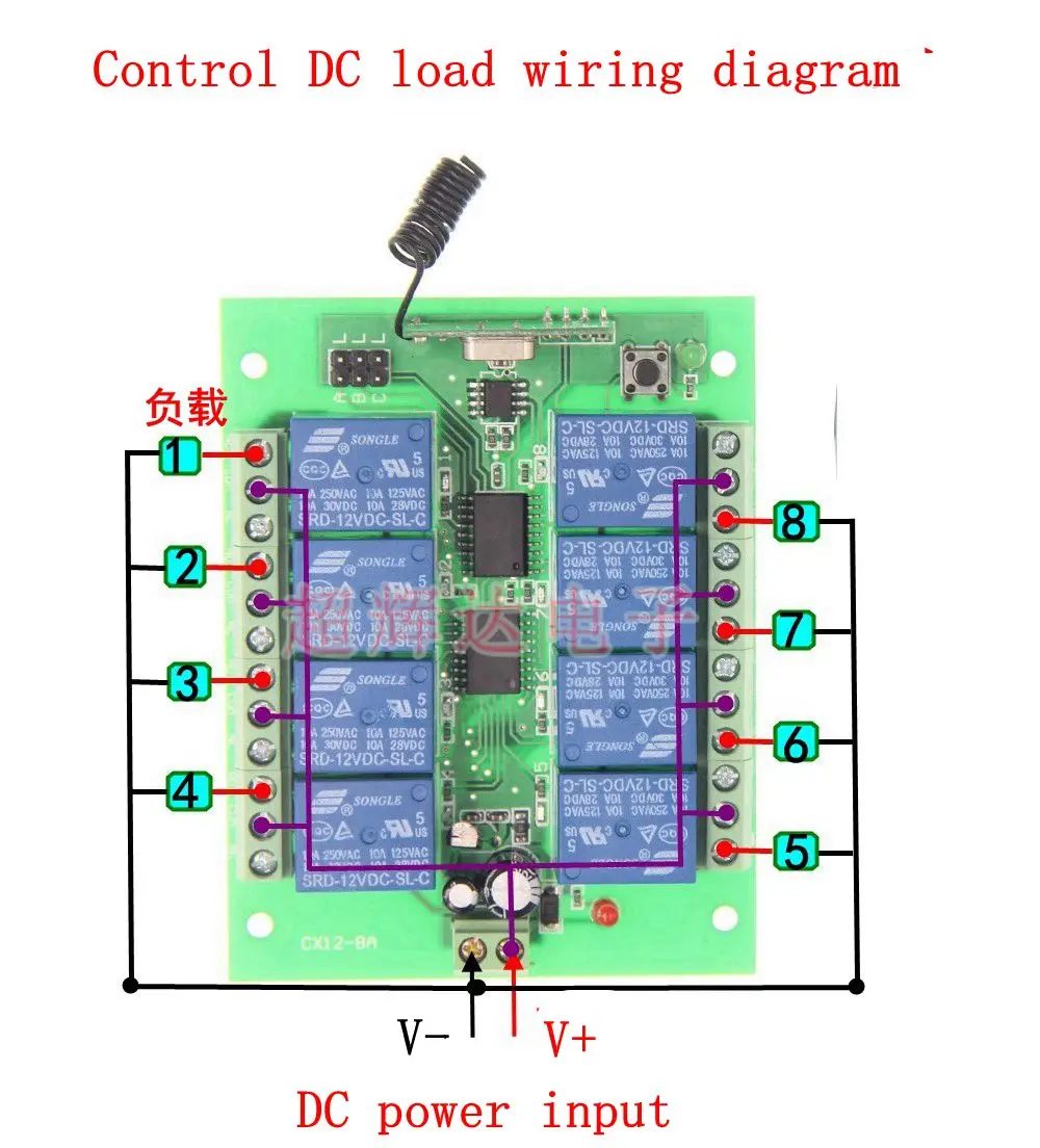 Каждая схема приемной платы может иметь максимальный ток 10А и может непосредственно управлять нагрузкой постоянного/переменного тока. Каждое реле имеет набор нормально открытых (нормально замкнутых) контактов. Для того чтобы продлить срок службы приемной платы, компания не рекомендует контролировать нагрузку высокой мощности. При управлении 220 В максимальная управляемая мощность каждой цепи составляет 500 Вт, а при управлении 12 В максимальная управляемая мощность каждой цепи составляет 50 Вт.