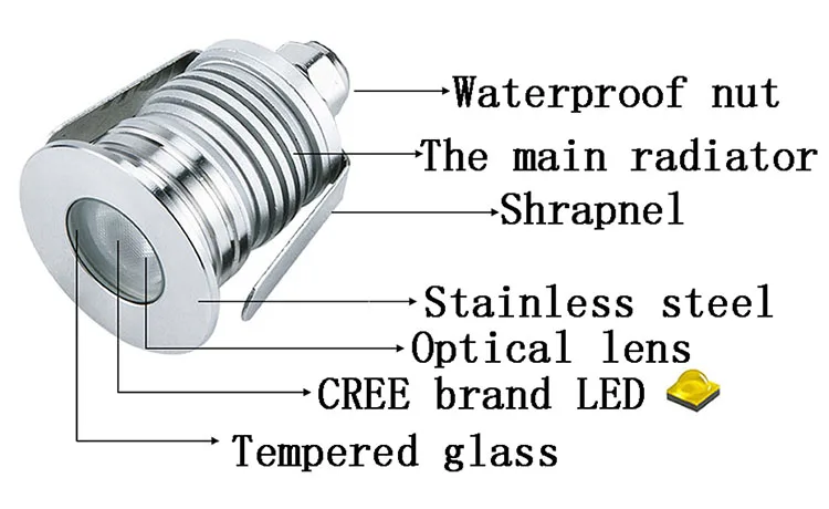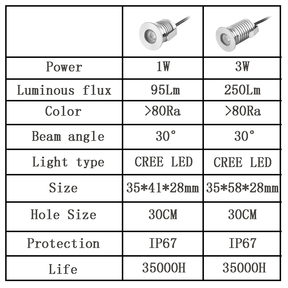 Мощность: 1 Вт/3 Вт CREE-XBD светодиодовЛюмен: 95 лм/ВтВходное напряжение: AC/DC12V-DC24VУгол светового луча: 45 ° 60 ° 15 ° (обычный 45 °)Класс защиты: IP 67Основной материал: алюминийРазмер корпуса: d35мм x 41 мм (1 Вт) d35мм x 58 мм (3 Вт)Рабочая температура: -25 °C ~ + 55 °CКабель: DC12V с водонепроницаемой клеммой 36 смГарантия: 3 года, сертификаты CE и ROHS, срок службы чипа 35000 часовЦветовая температура: теплый белый (2700-3000K), натуральный белый (4000-4500K), холодный белый (6000-6500K) другие варианты: красный, зеленый, синийИспользование: дорожный боковой свет, Квадратный свет, освесветильник Для дорожки светильник для сада, светильник для мостов и другое Наружное освещение Venus ing