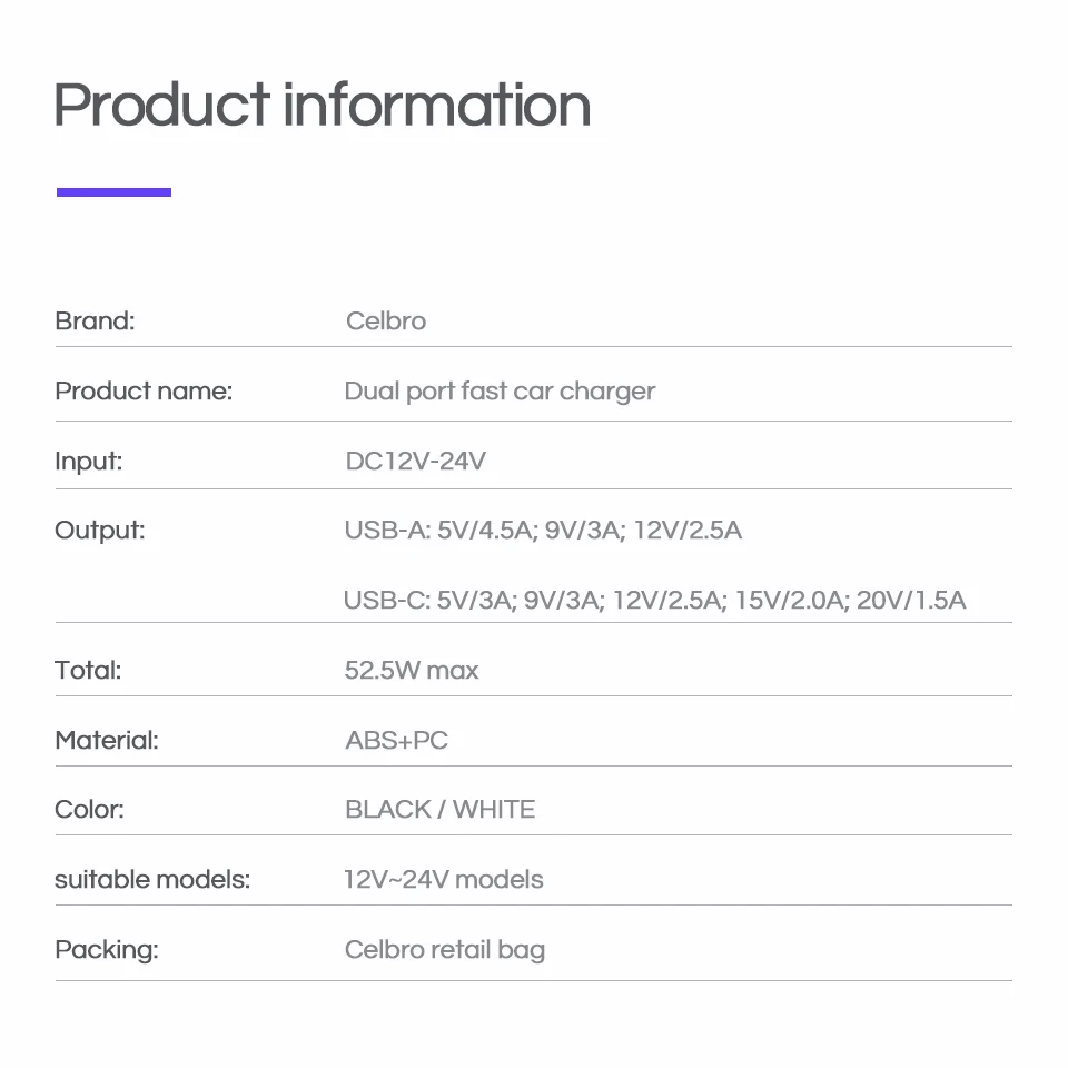 Бренд --- CelBro®Товар --- QC 3,0 + PD автомобильное зарядное устройствоВход --- 12-24 ВВыход PD/PPS 30 Вт -- 5 В/3A,9 В/3A,12 В/2.5A,15 в/2A,20 В/1.5AВыход QC3.0 --- 5 В/4.5A,9 В/3A,12 В/2.5AМатериал --- ABS + PC(V0)Сертификация --- CE, FCC, RoHSЦвет --- черный/белый