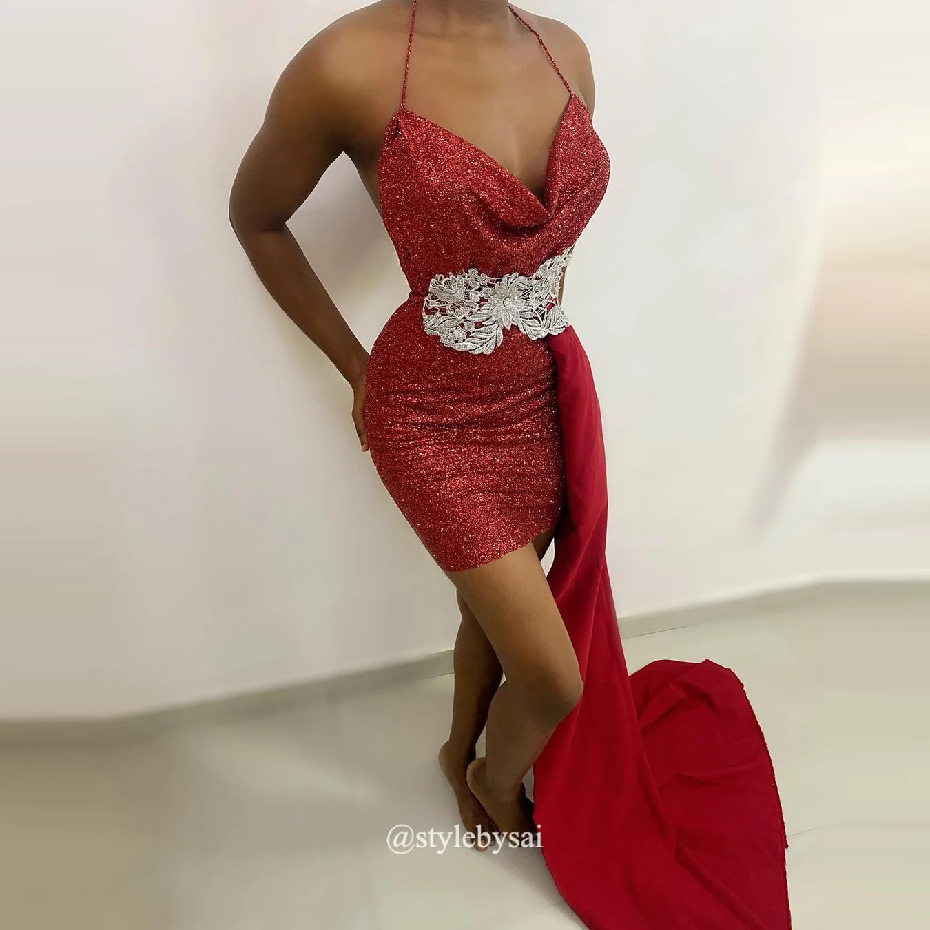 Атласное короткое вечернее платье-мини Aso Ebi, на бретелях, с V-образным вырезом и оборками