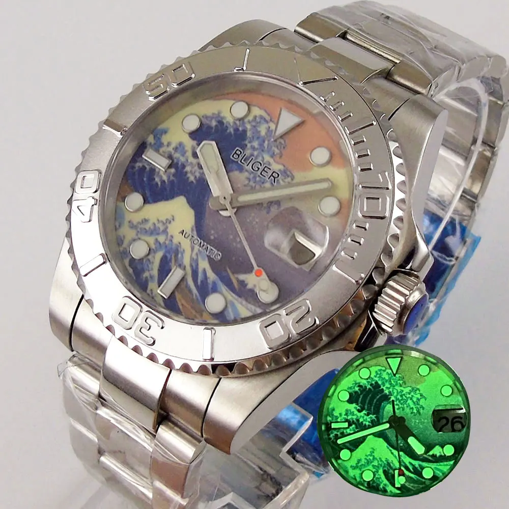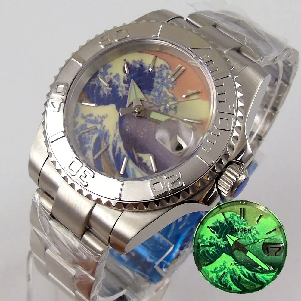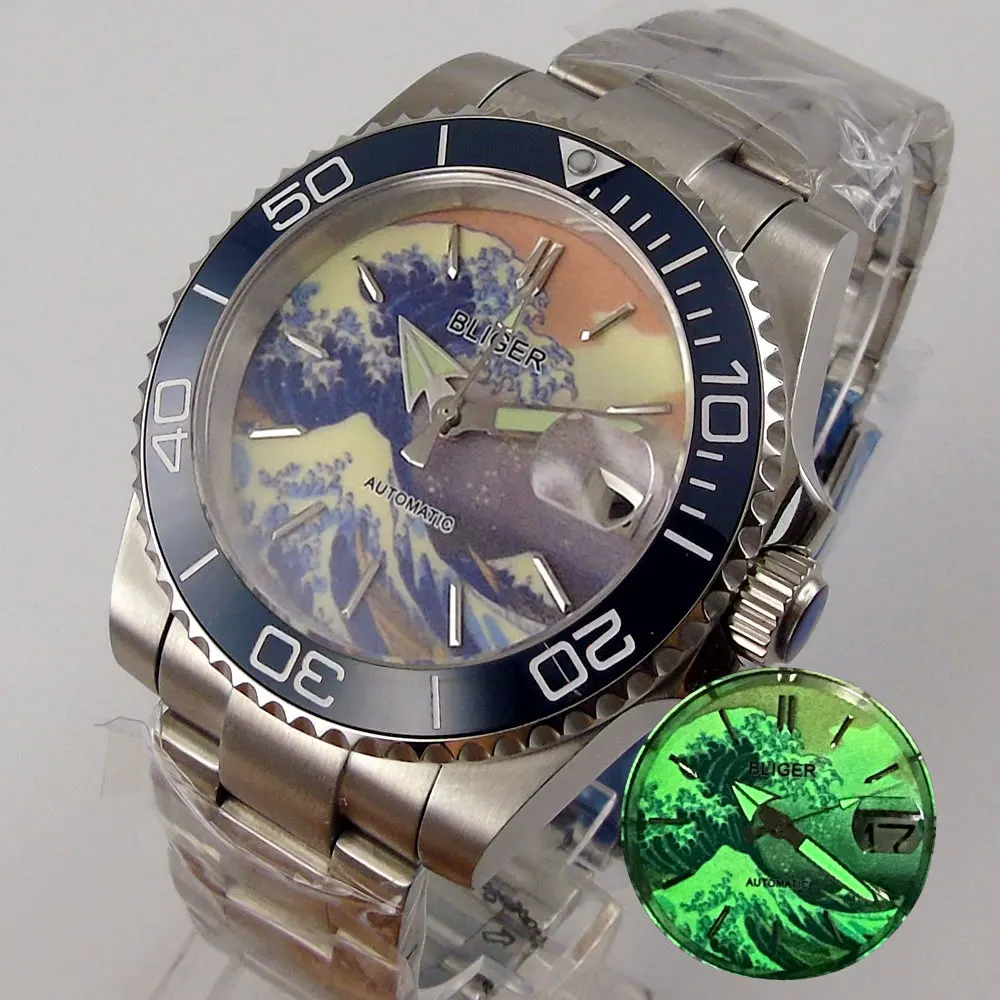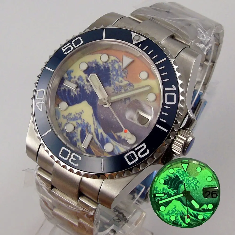 Мужские автоматические часы NH35 Kanagawa, серфинг, циферблат, сапфировое стекло, дата, циклапс, браслет, вращающийся керамический ободок, 40 мм