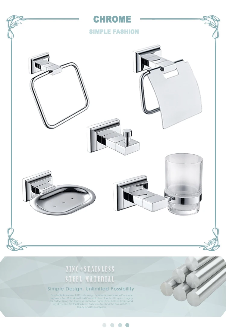 Особенности и характеристики:Набор оборудования для ванной комнатыКрючок для халата, бумажный держатель, мыльница, кольцо для полотенец, стакан для зубной щетки и держатель для стаканаМатериал: цинк + нержавеющая стальИспользование: ванная комната/душевая комната/туалетЦвет: хромТип: аксессуары для ванной комнатыУстановка: НастенныйВключая все монтажные фитинги