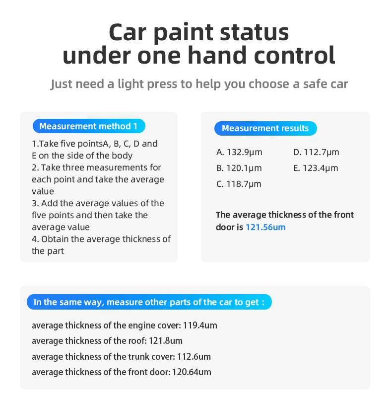 Автомобильная краска statusunder one hand controlМетод измерения:1. Возьмите пять точек A, B, C, D и E на стороне тела2. Сделайте три измерения для каждой точки и возьмите среднее значение3. Добавьте средние значения пяти точек, а затем Возьмите среднее значение4. Получить среднюю толщину детали