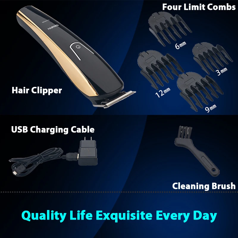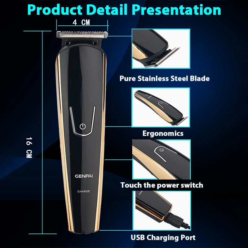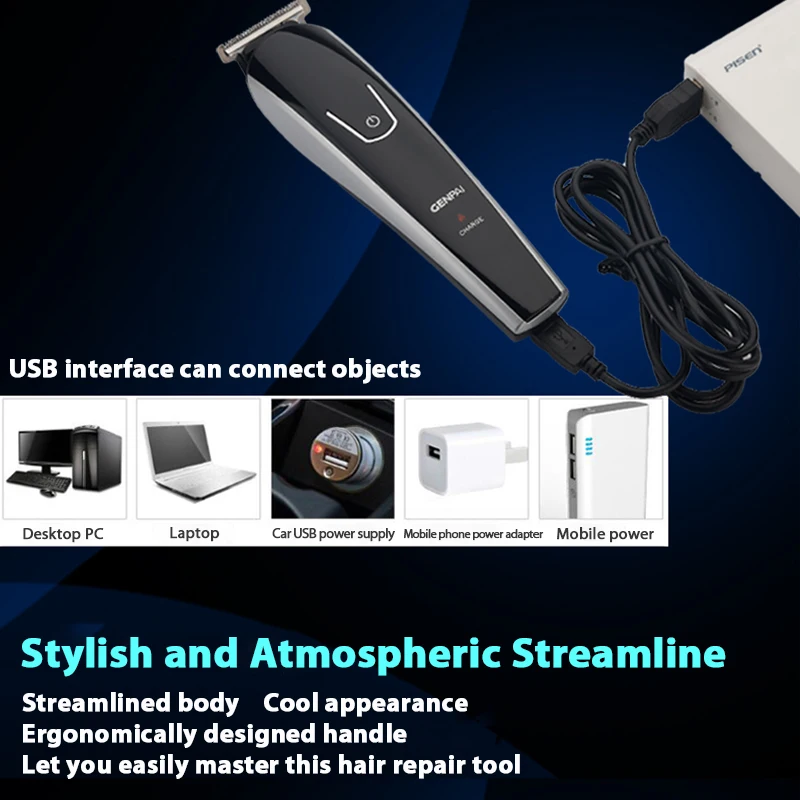 Название продукта: профессиональный мужской триммер для волос Мощность: 10 Вт Размеры: 19x6.5x4.3cm Вес: около 200 г Время зарядки: 2 ч Время использования: 3 ч Метод зарядки: Прямая зарядка через USB