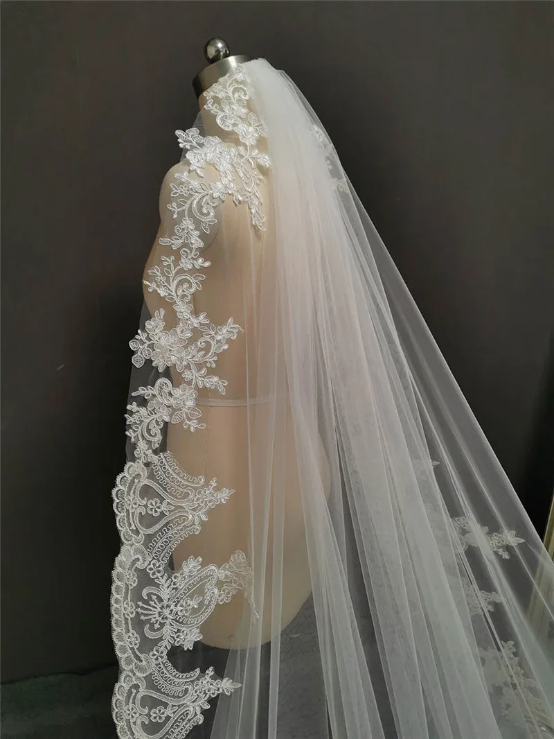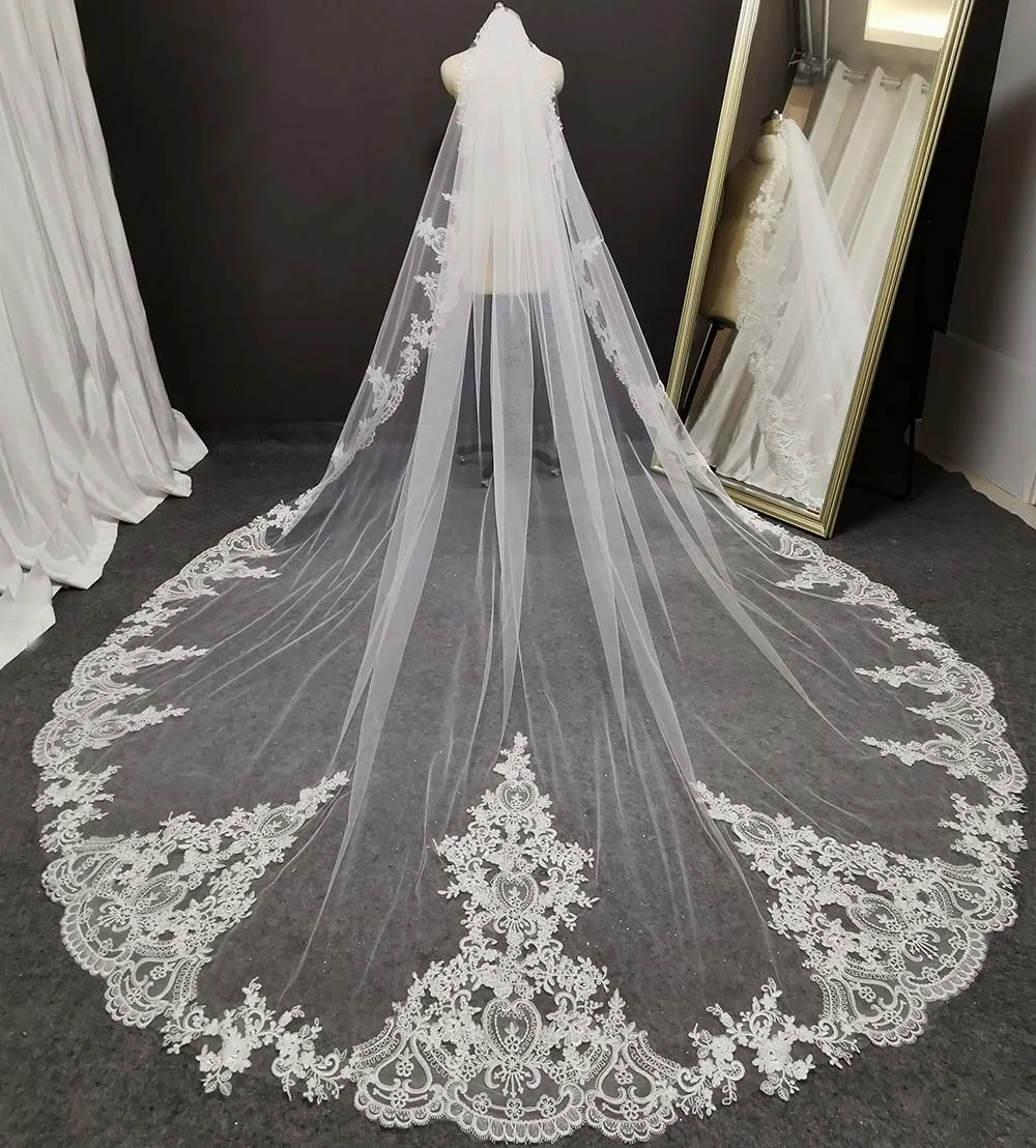 Новая кружевная Длинная свадебная вуаль, однослойная свадебная вуал...