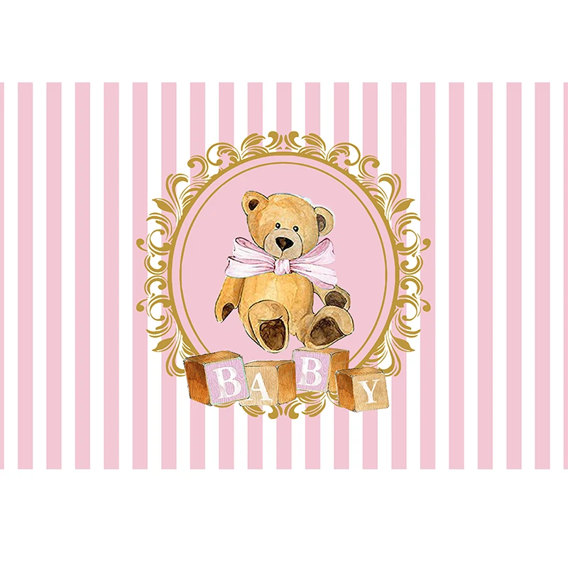 Фон для фотосъемки новорожденных с изображением медвежонка и девочки в белую и розовую полоску