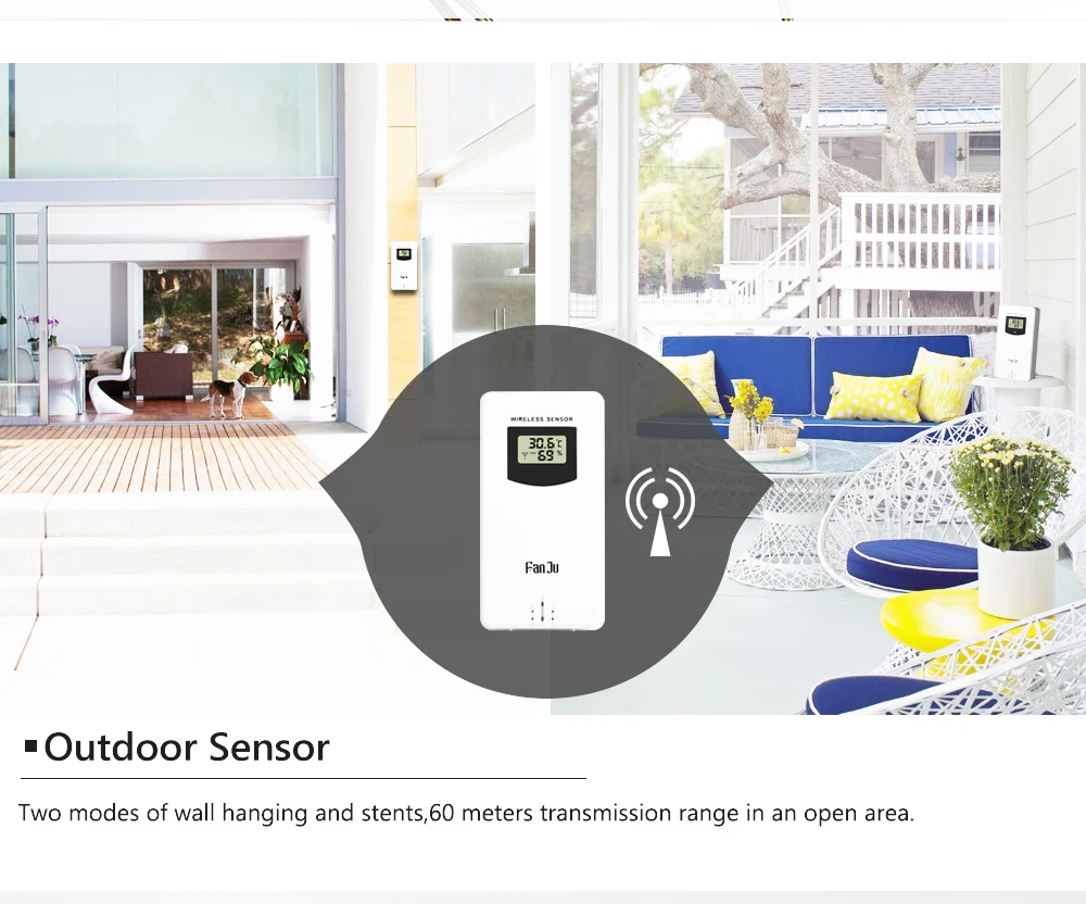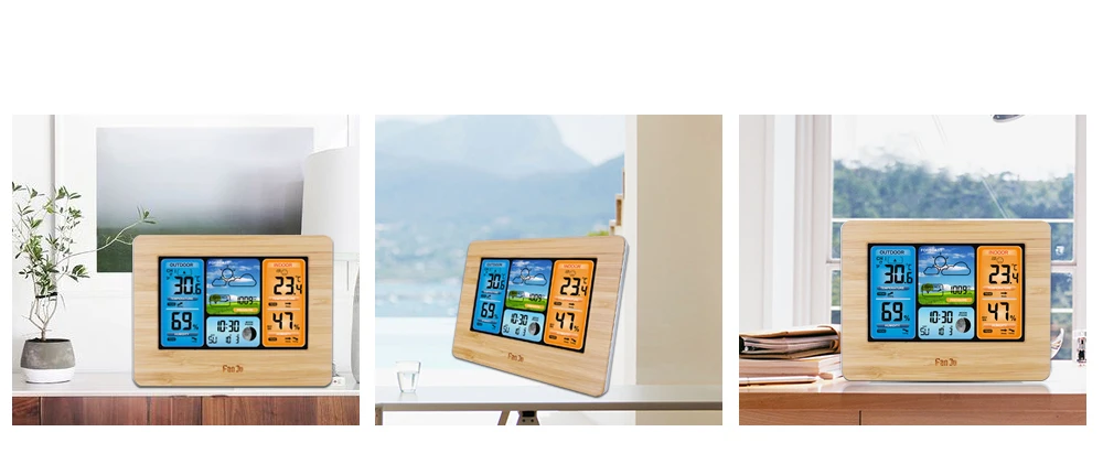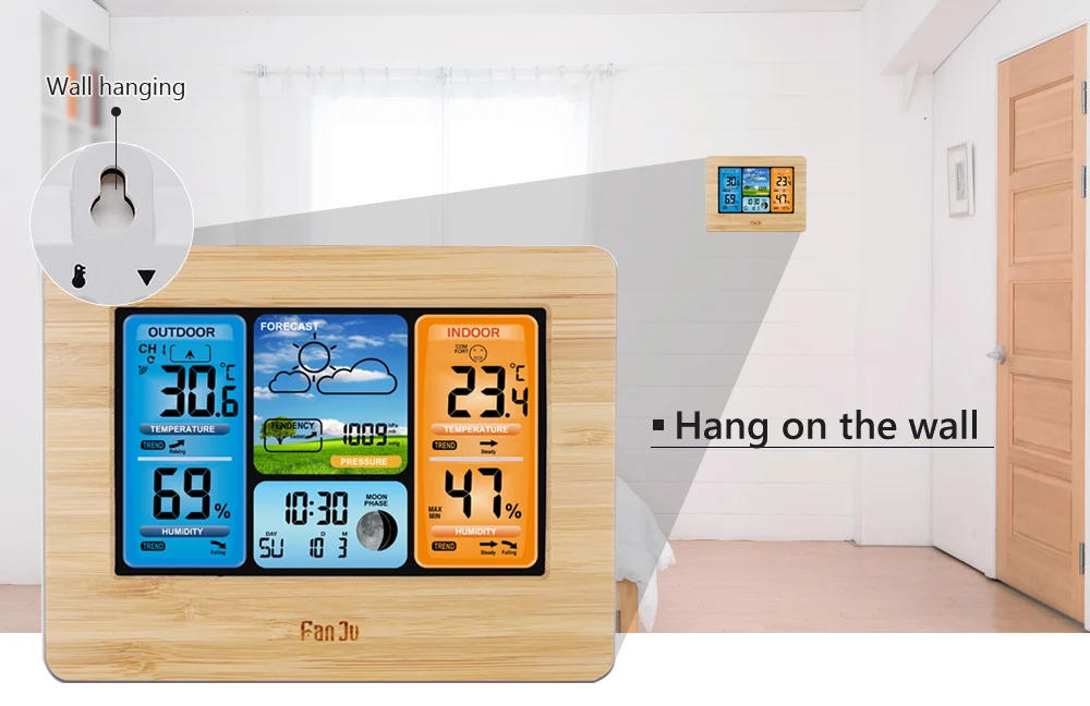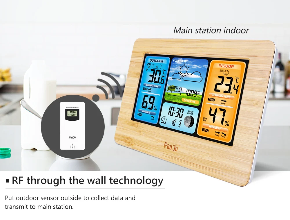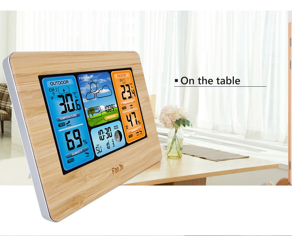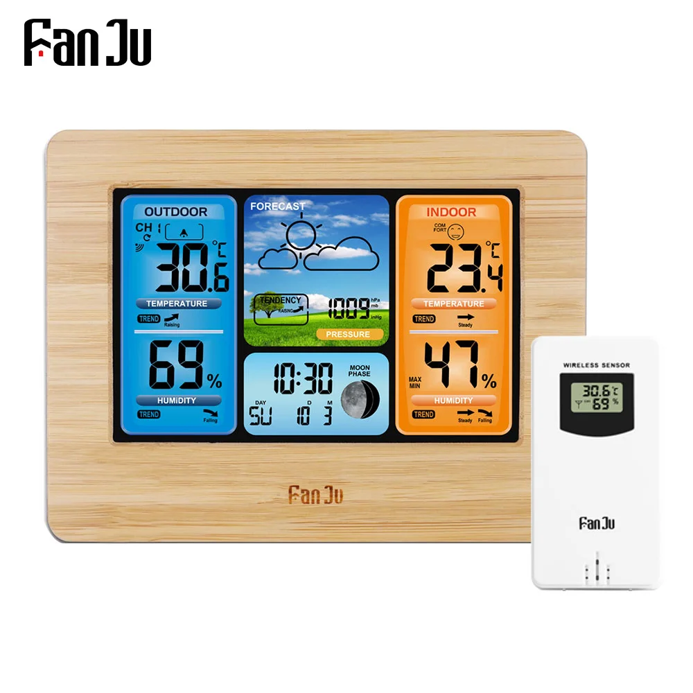 FanJu Беспроводные цифровые часы с термометром, гигрометром, барометром, метеостанцией, будильником, прогнозом, ежедневные электронные настенные часы