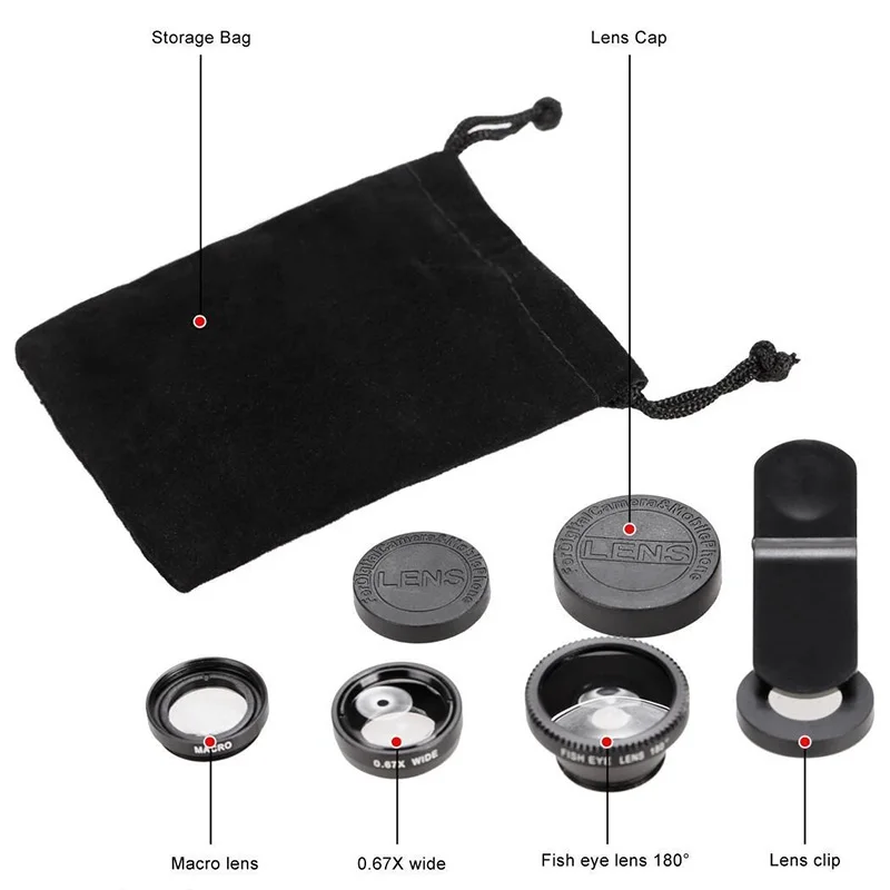 Точка пули:Линза Рыбий глаз (линза рыбий глаз 180 градусов) имеет большой угол и иллюзорен, как рыбий глаз.Широкоугольный объектив (Широкоугольный объектив 0,67x) телефон может увеличить дальность съемки на 50%.Макрообъектив (макрообъектив 10 раз) для съемки небольших объектов, которые невооруженным глазом.Сумка для линз из микрофибры для хранения линз.Макрообъектив и широкоугольный объектив объединены, широкоугольный объектив 0,67 откручивается, что позволяет использовать функцию макросъемки.Упаковочный лист