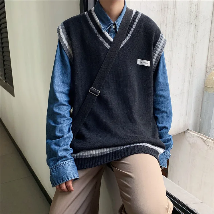 Вязаная жилетка с Для мужчин с v-образным вырезом, вязаный свитер пары размера плюс негабаритных Harajuku жилеты шикарный корейский стиль пуловер для отдыха