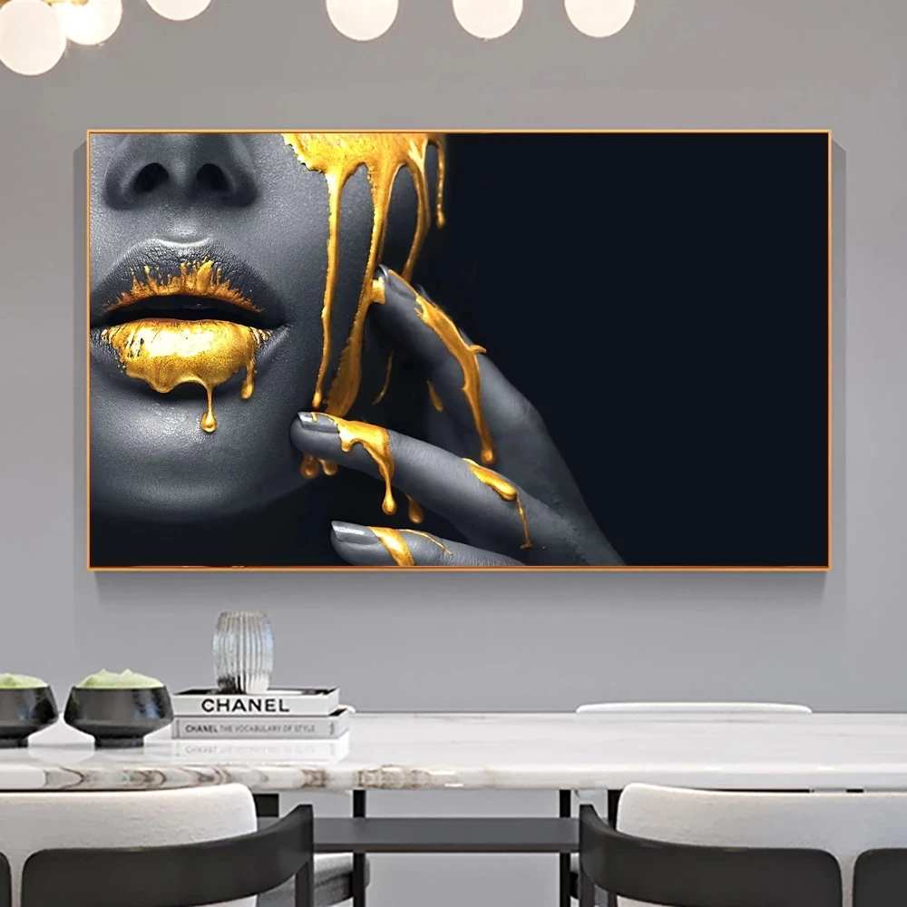 Золотые капли воды на губах черной красоты в скандинавском стиле современный холст фотография стены домашний декор