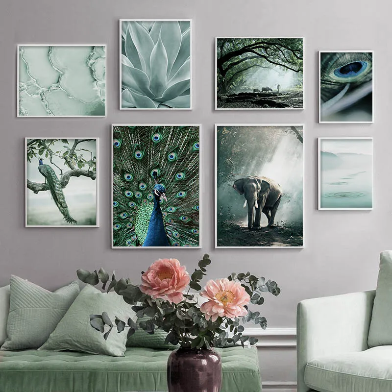 Природный лес, холст, постер, пейзаж, павлин, слон, настенная живопись, печать, перо, декоративная картина, скандинавский Декор для дома