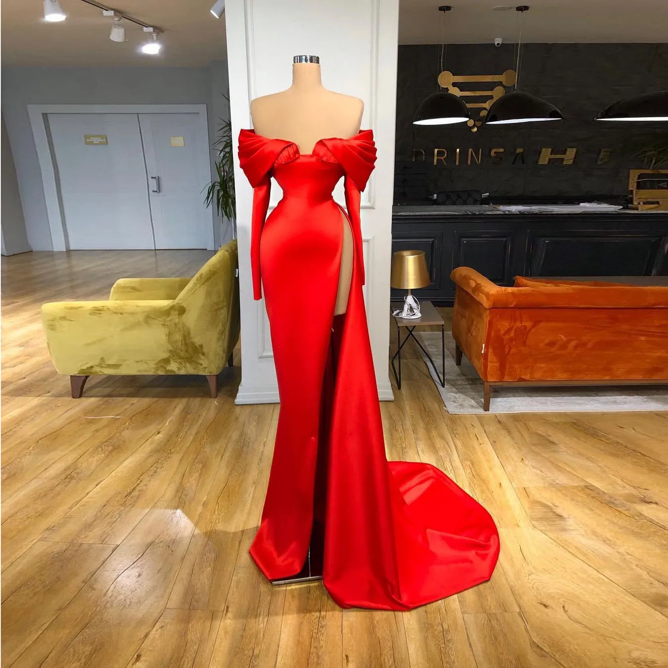 Элегантные красные атласные вечерние платья с открытыми плечами и длинными рукавами, Привлекательное Женское платье со шлейфом, официальное вечернее платье, Халат