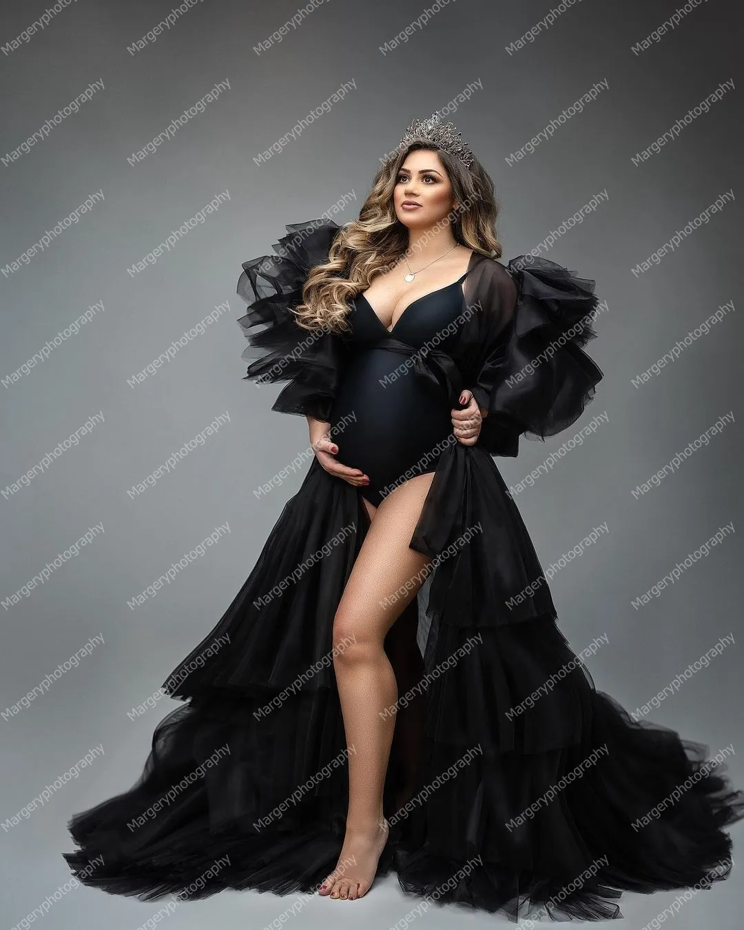 Платье для беременных, из тюля, с длинным рукавом, с пышными оборками