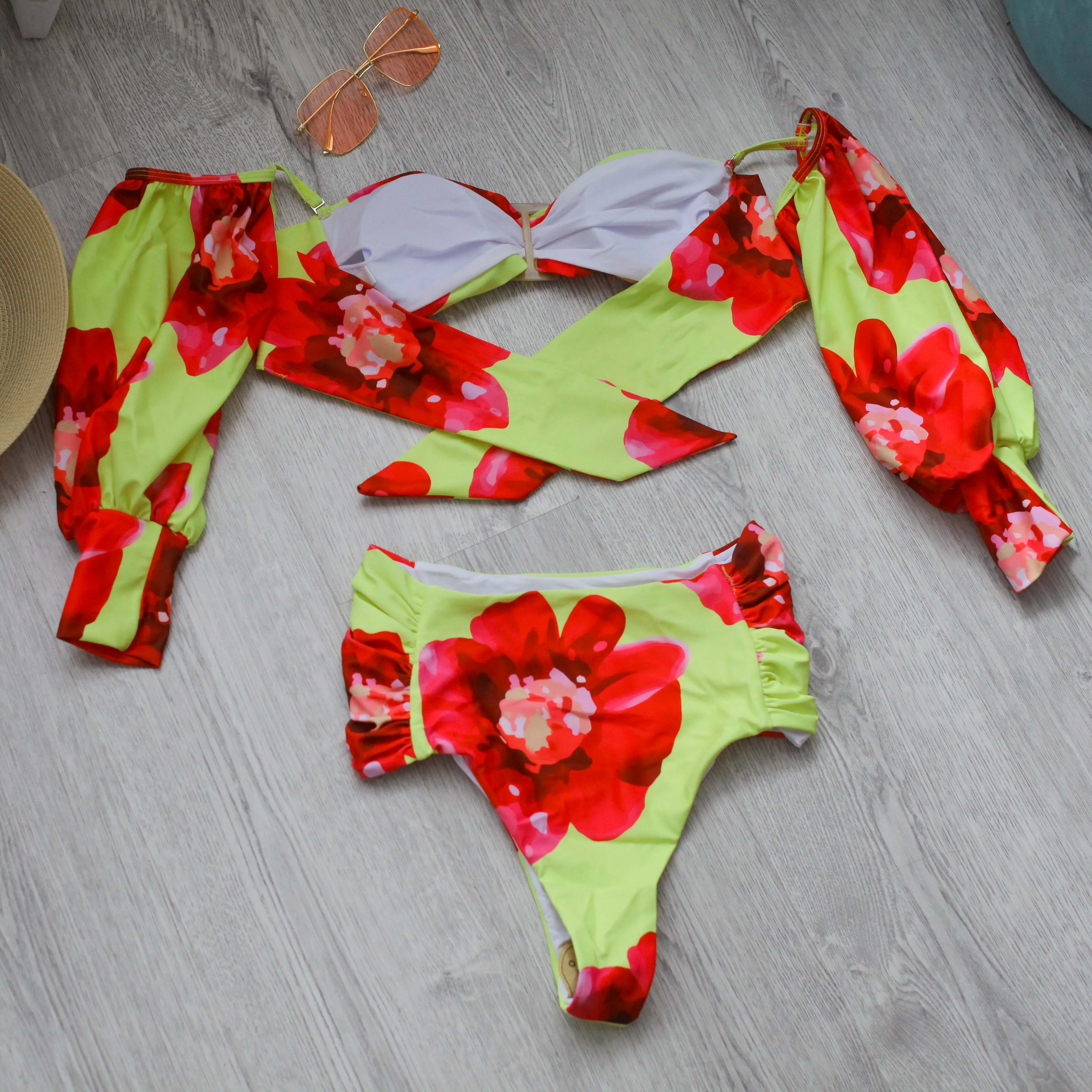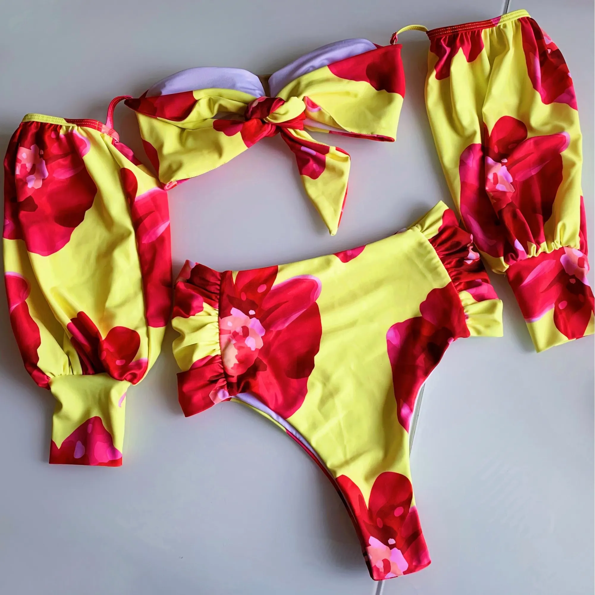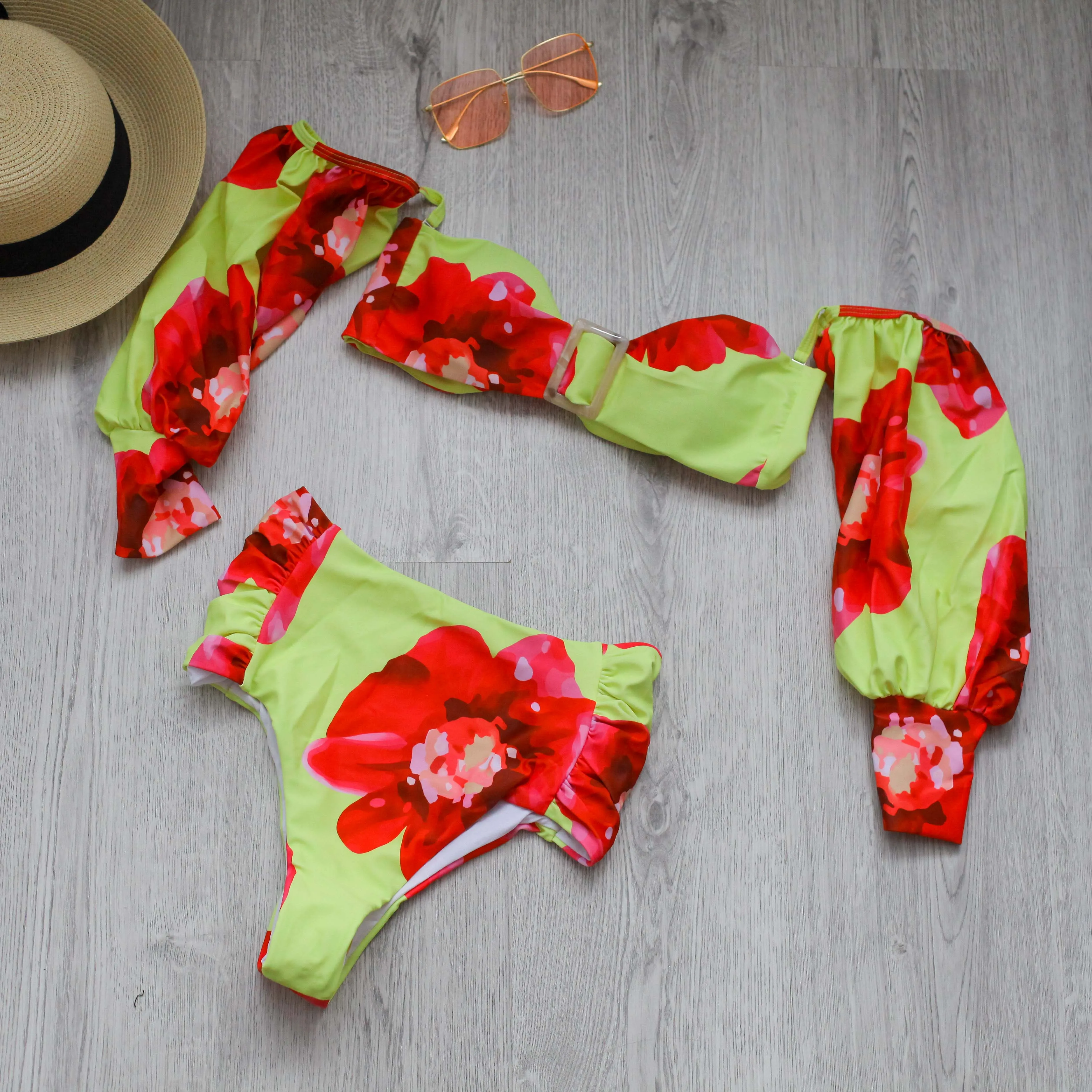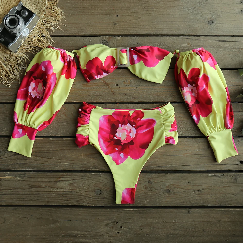 Бикини с высокой талией, новинка 2021, купальник с длинными рукавами, купальники с открытыми плечами, женские бикини с пузырьковыми рукавами, сексуальная сетчатая пляжная одежда