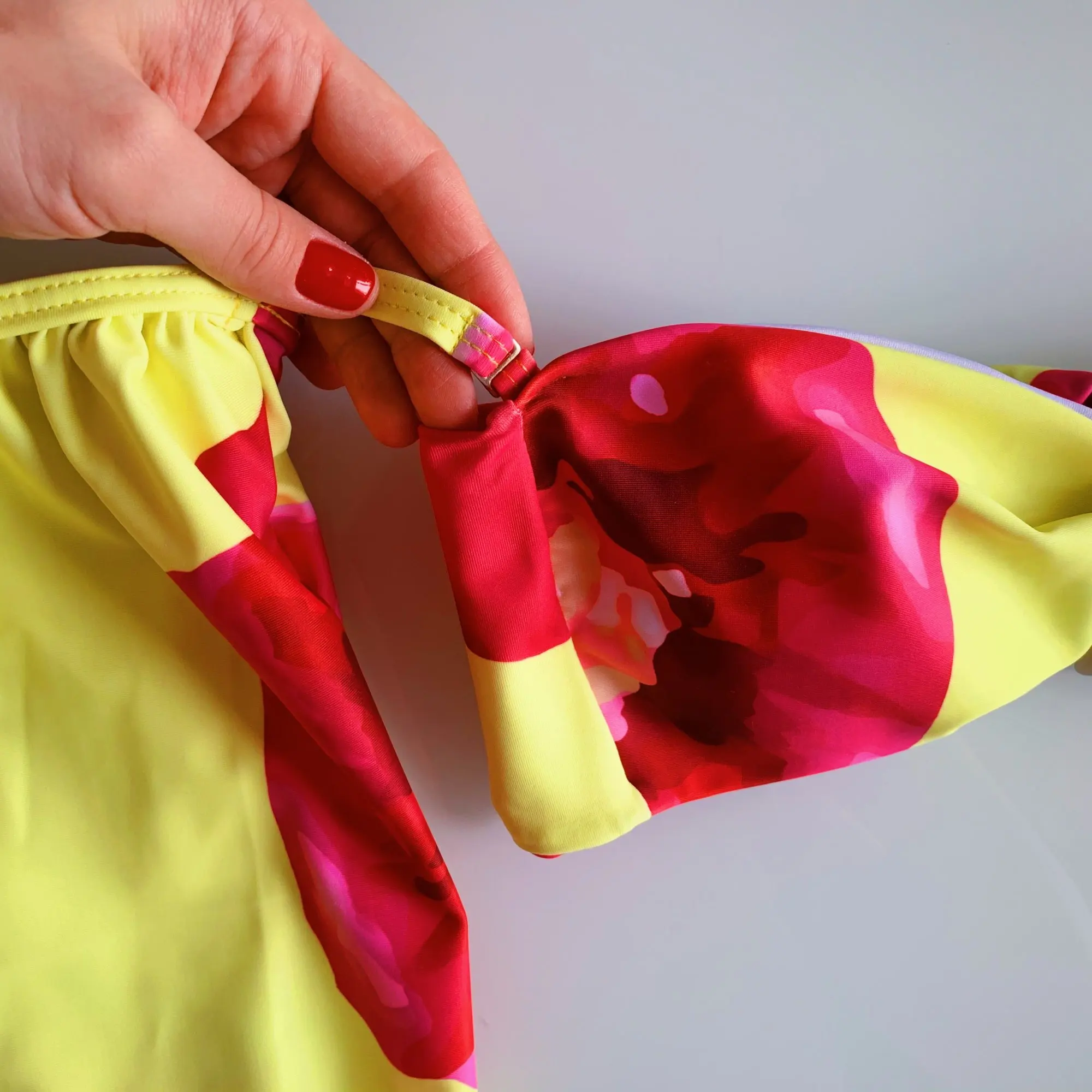 Доставка 2 недели. Я заказала маркировку S на параметры 85-68-88, рост 163 - идеально подошло. Верх купальника на завязке по объему. Бретели отсутствуют. Рукава отстегиваются, на крючках. Есть съемные чашечки. Трусики с высокой посадкой. Очень удобные. Подкладка белая. Гигиеническая наклейка присутствовала. Качество прекрасное. Материал плотный, хороший. Пошив аккуратный. Купальник просто прекрасный. Отличная модель. С рукава выглядит очень эффектно, а также их легко отстегнуть и получится довольно стандартная модель.