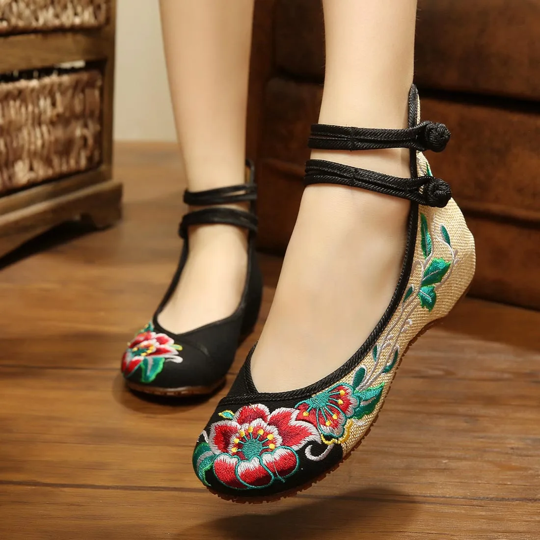Женская обувь в винтажном стиле; Ботинки с тканевым верхом с вышивкой балетки на плоской подошве; Большие размеры женские ткани размера плюс удобные балетки женская обувь с вышивкой