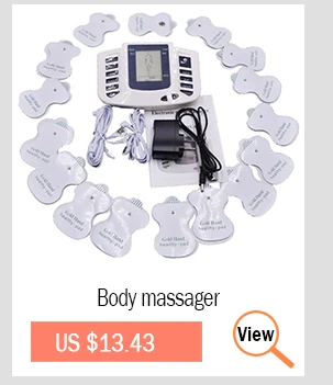 Внимание1. Перед использованием, пожалуйста, вставьте пластырь для физиотерапии на кожу перед включением источника питания.2. Во время использования, не перемещайте патч вверх или на других людей3. Если вы чувствуете дискомфорт во время использования, прекратите использовать его немедленно.4. Не используйте другие источники питания, кроме номинального напряжения5. Пожалуйста, не разбирайте и не ремонтируйте эту машину, за исключением ремонта6. Не используйте в ванной, кухне и других влажных или горячих местах.Метод храненияЕсли машина перестанет работать слишком долго, снимите аккумулятор и сохраните его отдельно.Посылка включает в себя: (батарейки AAA не входят в комплект)Массажер * 1Электродные прокладки * 4USB кабель * 1Адаптер питания (США/ЕС) * 1Руководство пользователя на английском языке * 1Соединительный кабель * 2 (2-полосный)