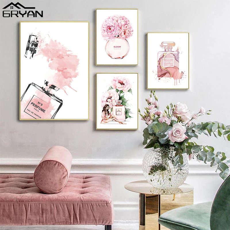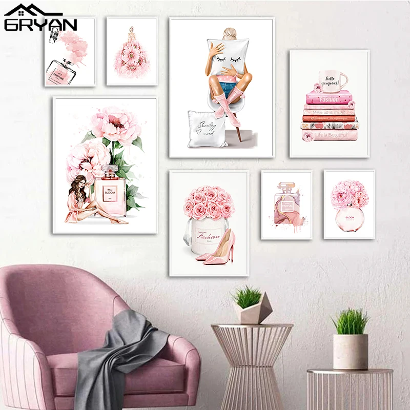 Картина на холсте с розовыми цветами, Настенная картина, модный постер с сексуальными девушками для макияжа, парфюма, обуви, современная модная печать, украшение для салона