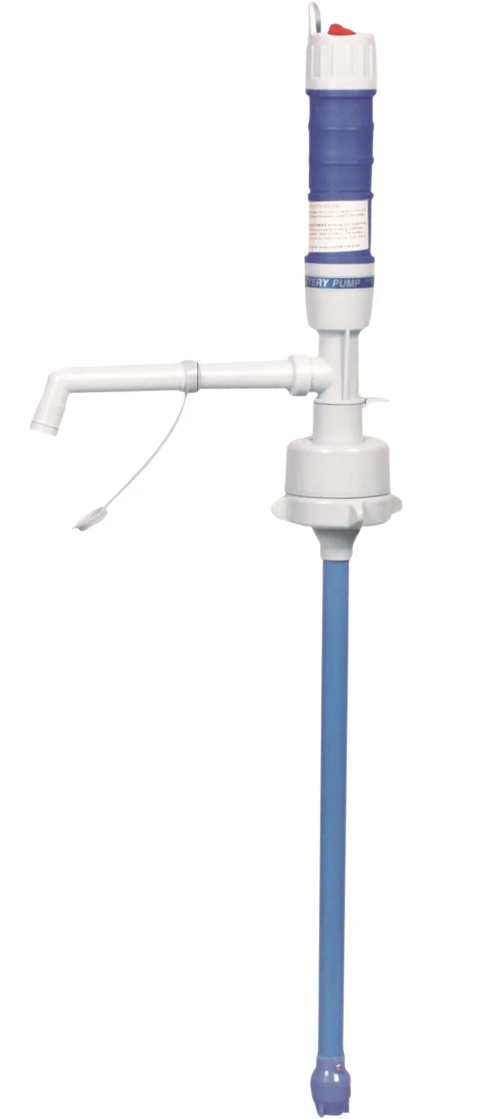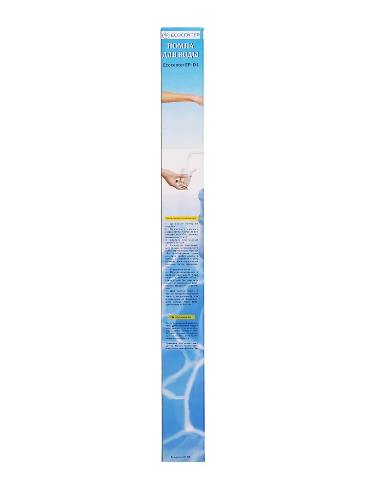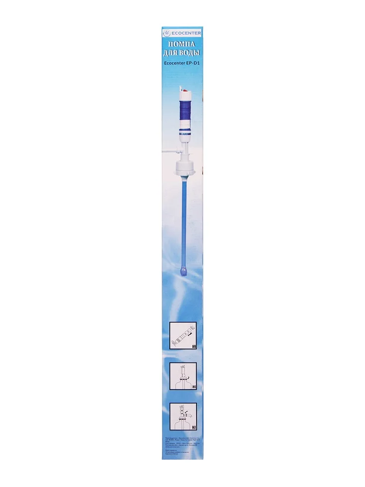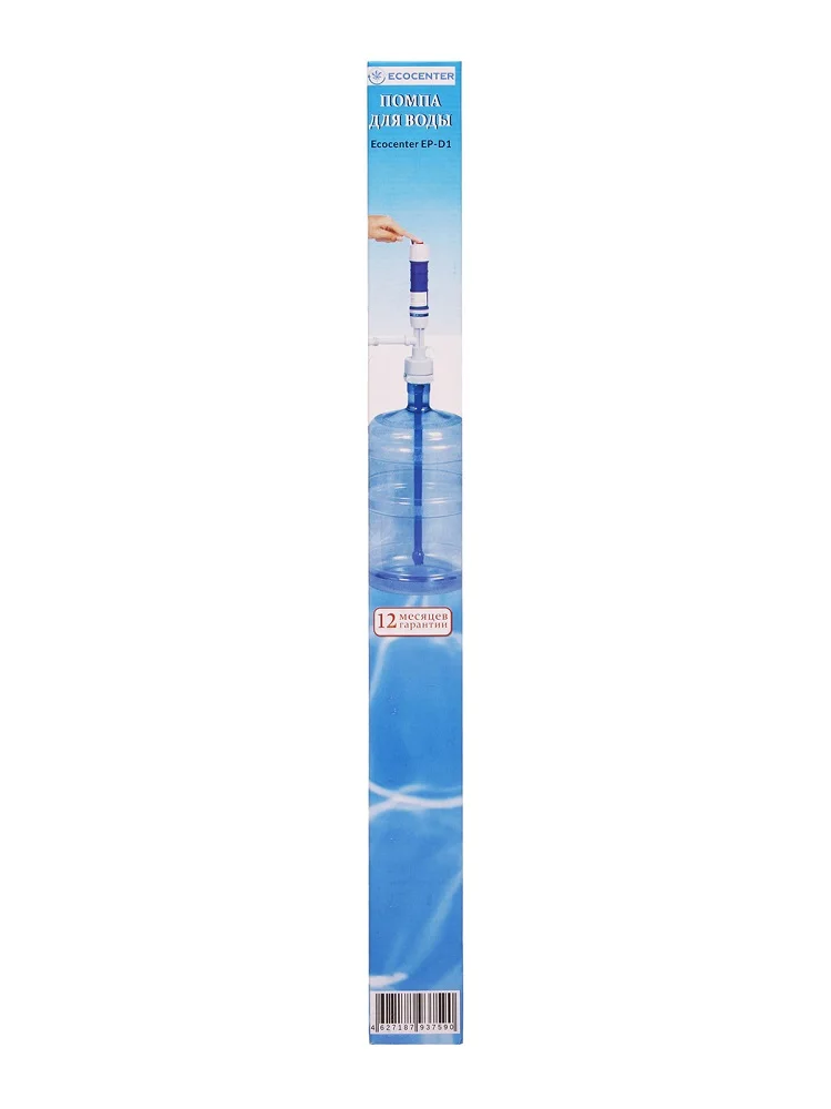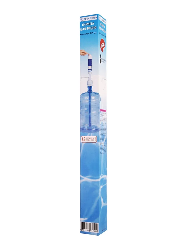 Электрическая помпа для воды Ecocenter EP-D1. Работает от батареек типа LR20x2 (не входят в комплект). Предусмотрена подача воды при нажатии на красную кнопку. Производительность 4,8 Л/мин. При использовании алкалиновых батареек хватит перекачать не менее 8 бутылей 19л. Помпа крепиться при помощи надежного замка.