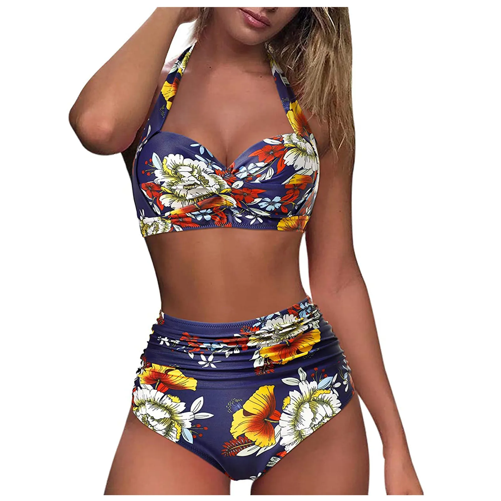Бикини с открытыми плечами 2021, купальник с цветочным принтом, женский купальник-бандо, Бандажное бикини на шнуровке, винтажный купальный костюм, комплект бикини