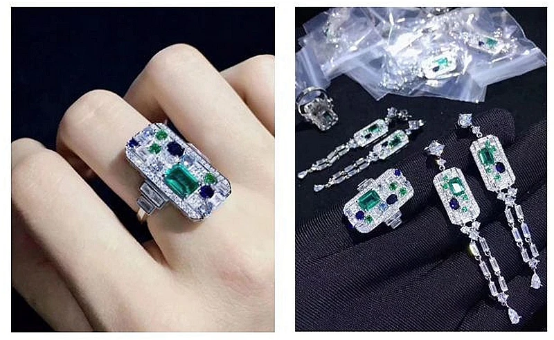 Комплект из кольца и серёг, с зеленым изумрудом