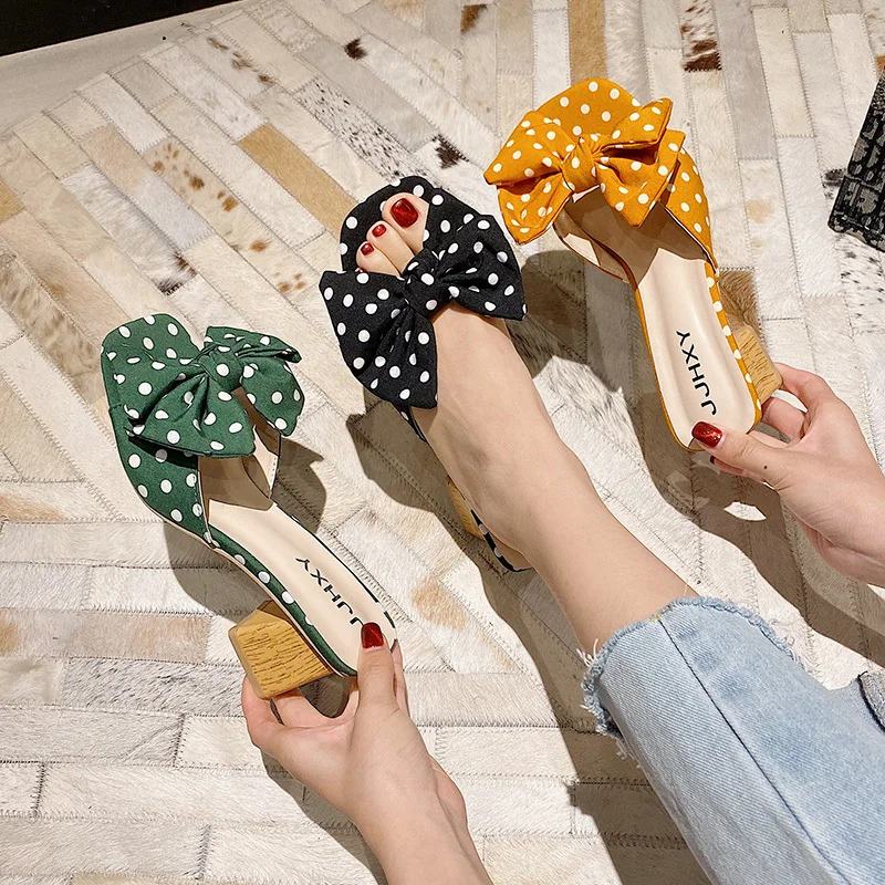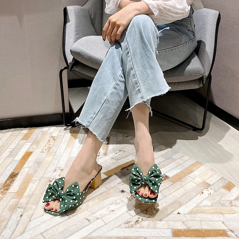 Шлепанцы женские на высоком каблуке, милые повседневные сандалии в горошек, с бантом, сланцы, сандалии с оборками, 2021