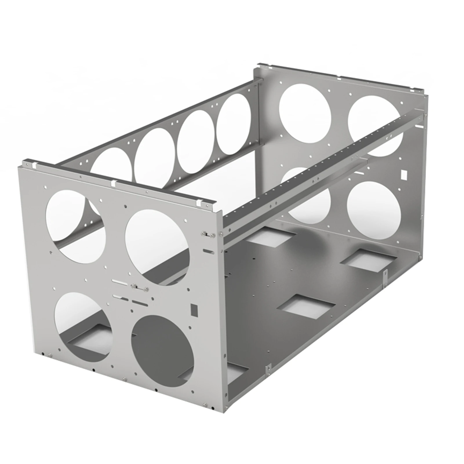 1. Этот продукт представляет собой Графический держатель для карт из листового металла с ЧПУ, который может быть сложен.2. Простота установки и прочная конструкция.Поддержка двойного источника питания.3. Разработан в соответствии со стандартными отверстиями материнских плат, видеокарт, жестких дисков и источников питания.4. Продукт является пустой полкой без вентиляторов, выключателей и ламп.5. Расстояние между 6 видеокартами 10 см, 8 графических карт 8 см, 10 видеокарт 6 см.