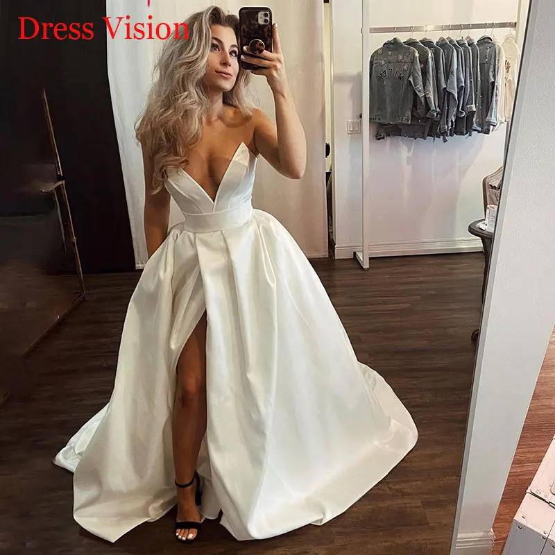 Свадебное платье с V-образным вырезом, высоким разрезом и шлейфом