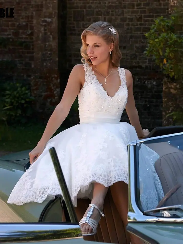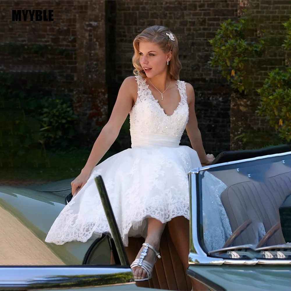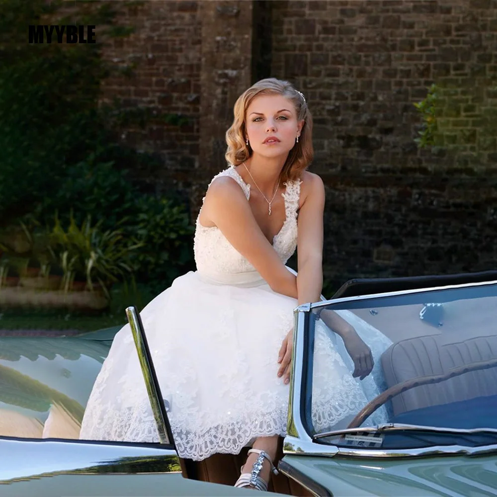 MYYBLE 2021 Короткие свадебные платья, свадебные платья с вышивкой, свадебные платья, блестящие атласные блестящие платья со шнуровкой и V-образным вырезом