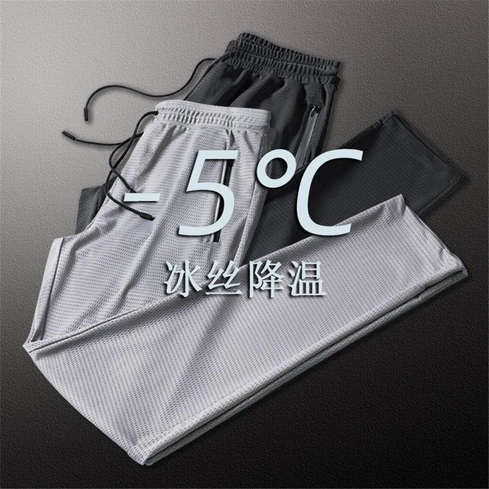 Летние шелковые спортивные брюки, мужские свободные дышащие брюки, брюки с поясом и прямые строгие дышащие
