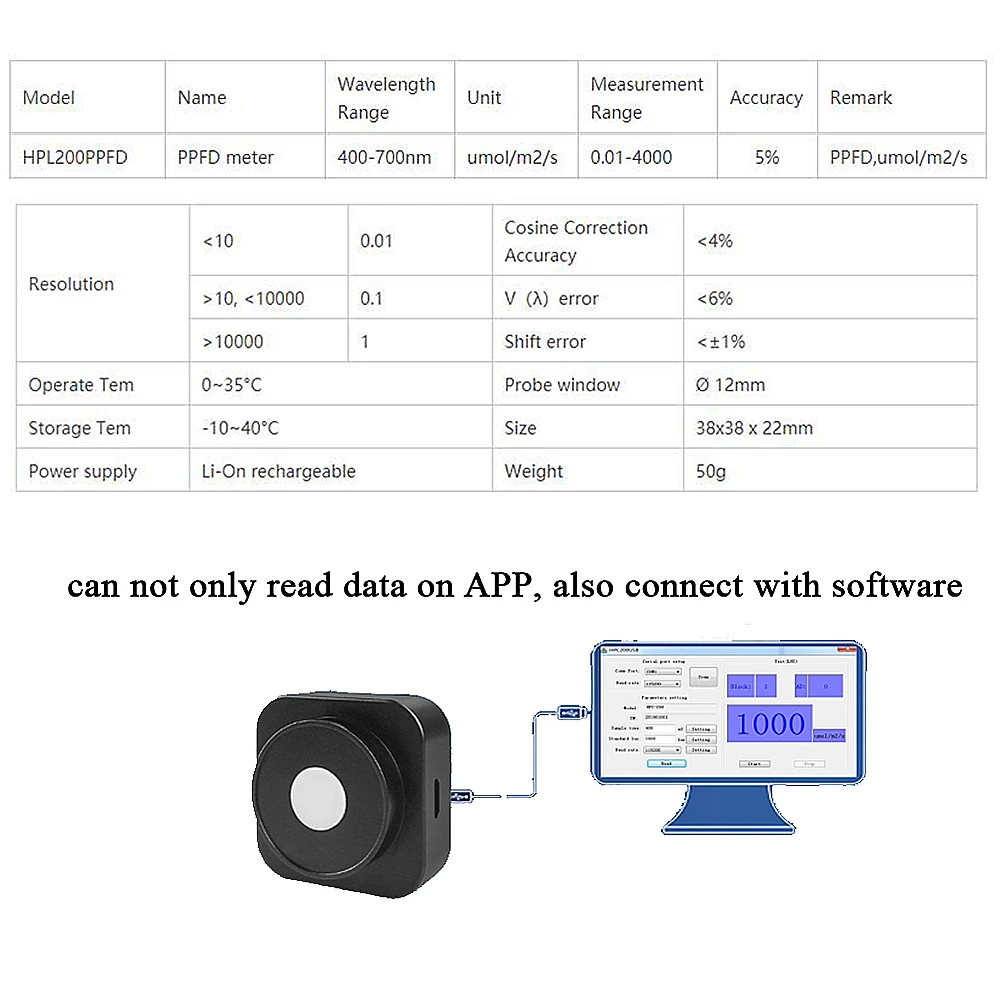 HPL200P измеряет плотность фотосинтетического потока фотона в пределах 400-700нм, беспроводное соединение Bluetooth. Мобильный телефон APP.