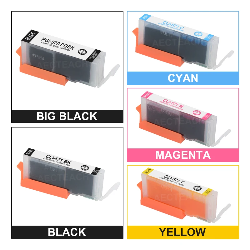 1 × черный картридж для PGI570 + 1 × фото черный картридж + 1 × Голубой картридж + 1 × пурпурный картридж + 1 × Желтый картридж для CLI571, полный с чернилами, с чипом