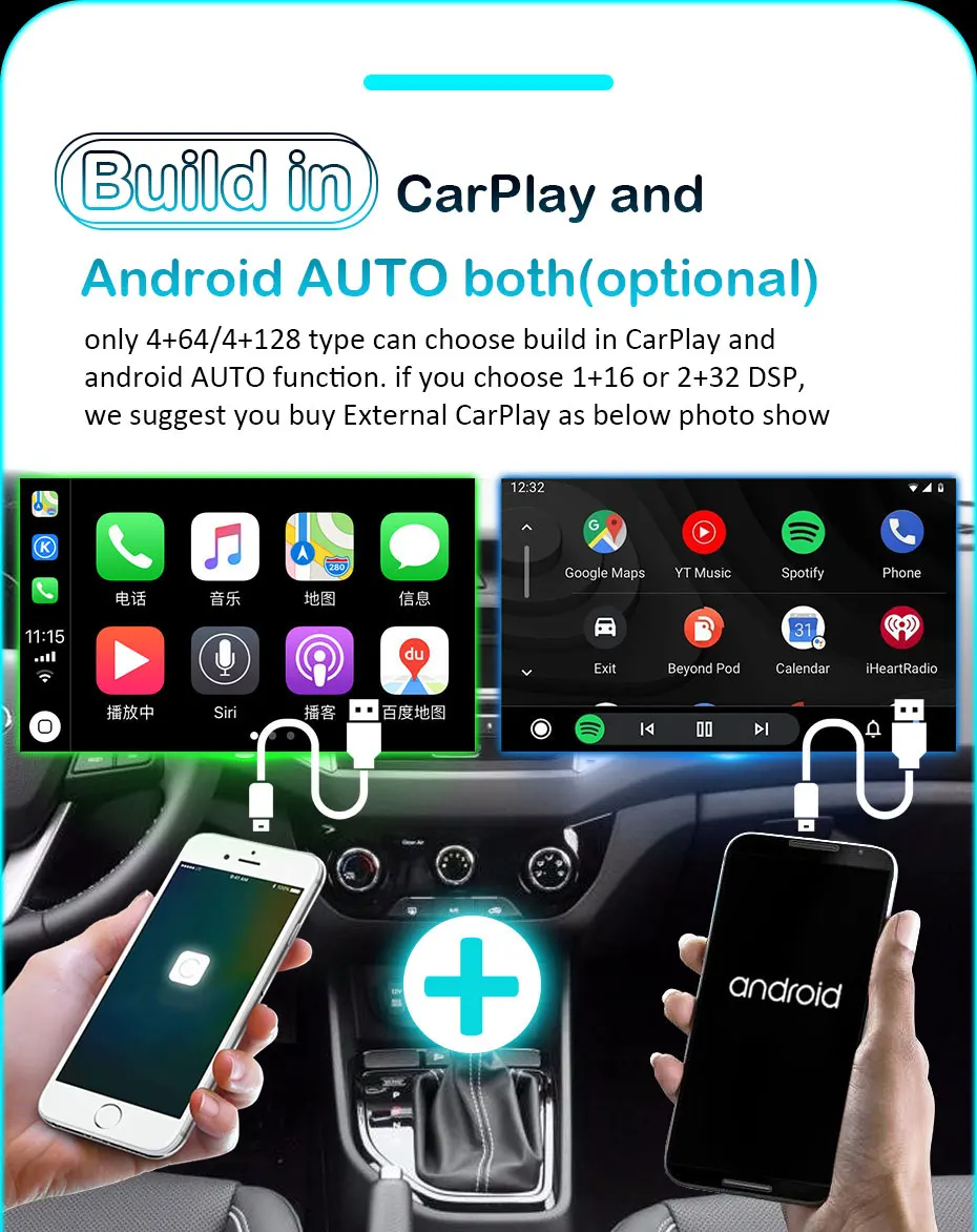 Только 4 + 64/4 + 128 типа можно выбрать встроенную функцию CarPlay и android AUTO. Если вы выбираете 1 + 16 или 2 + 32 DSP, мы предлагаем вам купить Внешний CarPlay, как показано ниже