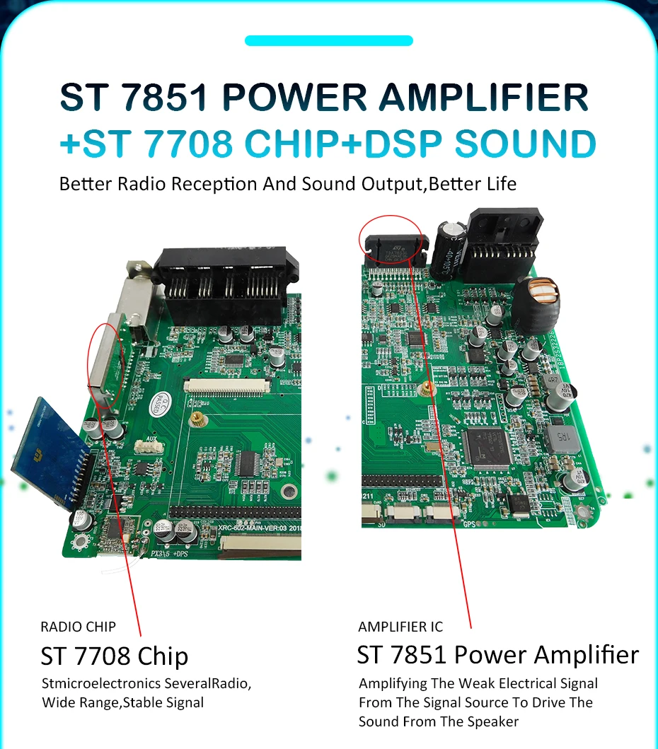 Радио использует чип радио-ST 7708 и лучший чип усилителя-ST 7851. ST 7851 является лучшим амплитудным IC на рынке в настоящее время. Лучше, чем 7388 и все остальные. Это делает качество звука автомобиля лучше, чем у других типов радио