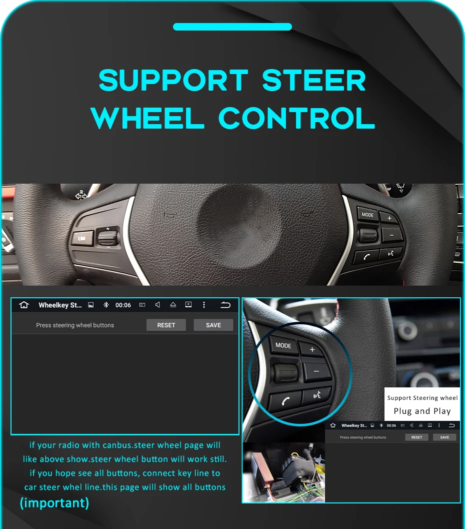 Все радиоприемники в нашем магазине поддерживают функцию управления поворотным колесом. Кнопки рулевого колеса вашего автомобиля могут управлять нашим радио после установки радио. (однако страница рулевого колеса обычно пуста. Если вы хотите увидеть кнопки aoo на странице рулевого колеса, вы можете просто подключить ключевую линию к линии рулевого колеса автомобиля, тогда вы увидите все кнопки рулевого колеса на странице) если кнопки поворотного колеса не работают, пожалуйста, не волнуйтесь и не спорьте, пожалуйста, оставьте нам сообщение, Мы поможем вам сделать работу на 100%.